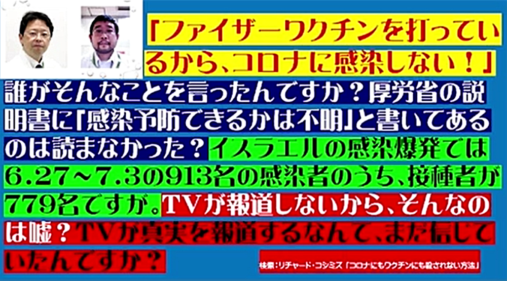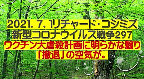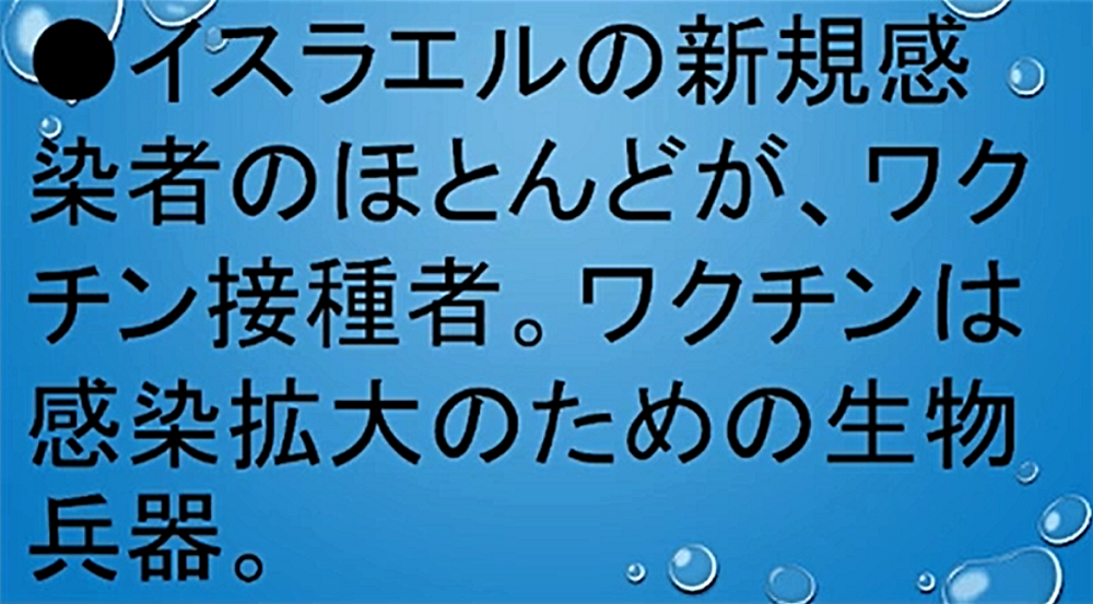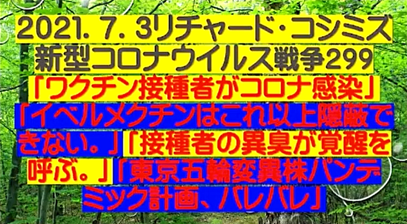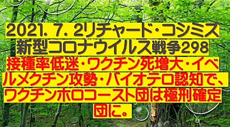 ◆イスラエルの新規感染者のほとんどが、ワクチン接種者。ワクチンは感染拡大のための「生物兵器」。 ◆米専門家:ワクチン接種済みの人が、デルタ株の拡大を助長していることは「疑いようがない」 ◆ワクチンの副反応は、医者が診察してくれないで、たらいまわし。 ◆ワクチンで死んでも、闇に葬られる。 ◆ワクチンを止めて、イベルメクチンを投与する。それだけのこと。日本以外で、起きていること。 ◆眼球網膜の血栓症による失明が、これから大きな問題になる。 ◆毒ワクチンを打ってしまったら。 ◆ワクチンパスポートの導入は、ワクチン強制と同じこと。大量殺人手口。 ◆東京五輪テロを先読みし、阻止しよう。 |