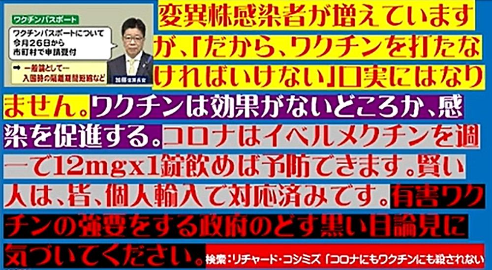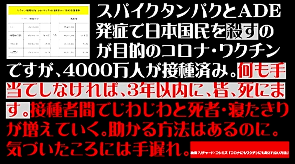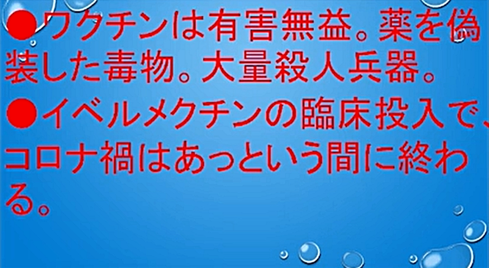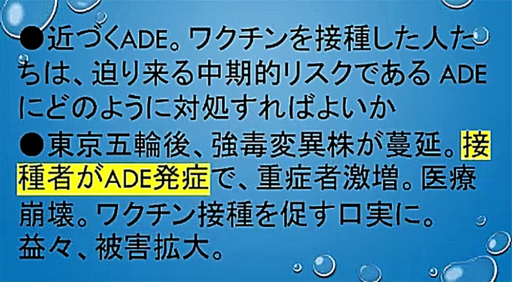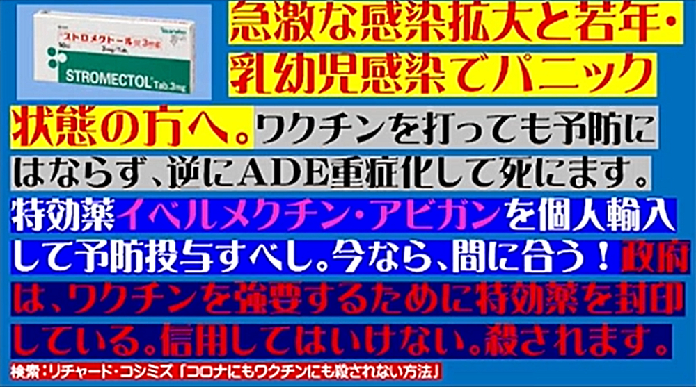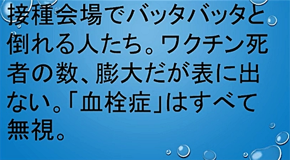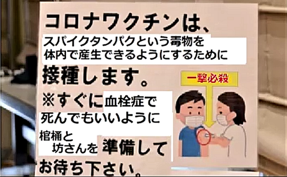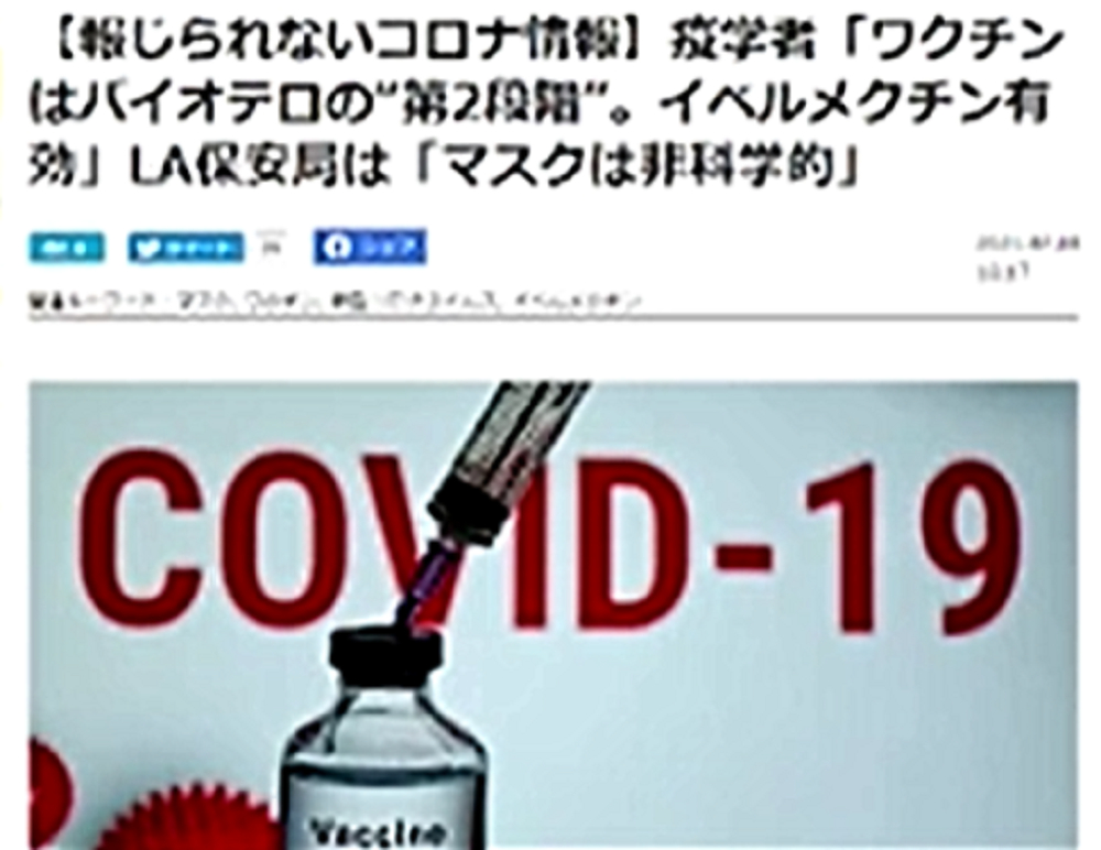 「『ワクチン大虐殺計画』に 明らかな翳り 『撤退の空気』が」 「コロナにもワクチンにも殺されない方法」を電子出版し、販売を開始しました。 ① 東京五輪変異株パンデミックで、ワクチン接種者がADE重 症化 ② ワクチン接種者からの分泌物で感染 ③ 接種者は3年以内に血栓症発症で重篤 「イベルメクチン」を海外調達して、命を守りましょう。 政府は国民の敵。ワクチンは致死薬。 |