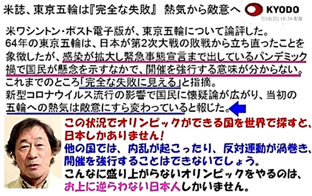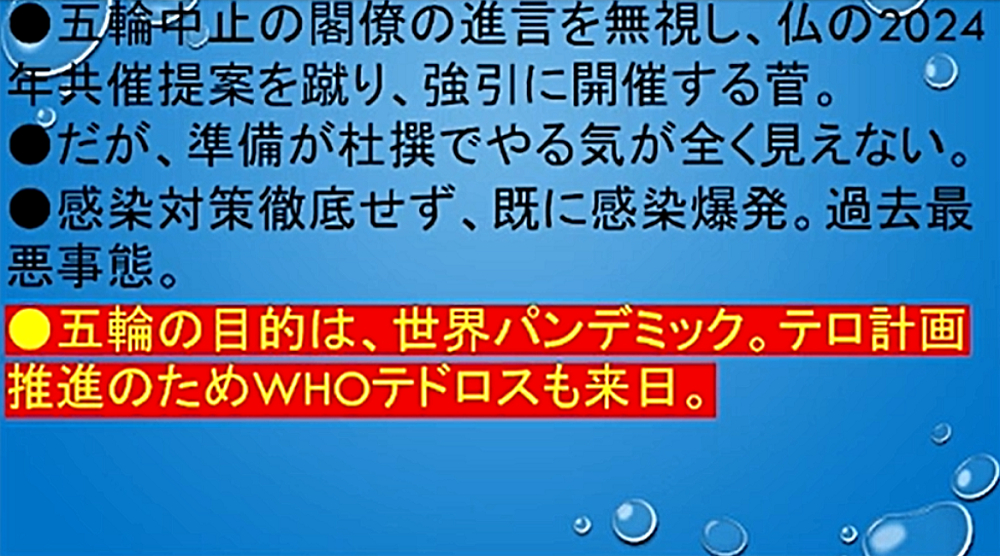 ◆五輪中止の閣僚の進言を無視し、仏の2024年共催提案を蹴り、強引に開催する菅。 ◆だが、準備が杜撰でやる気が全く見えない。 ◆感染対策徹底せず、既に感染爆発。過去最悪事態。 ◆五輪の目的は、世界パンデミック。テロ計画推進のためWHOテドロスも来日。 ◆毎週100人のペースで増えるワクチン死者。実数は、その10倍か? ◆ワクチン死者激増で、集団接種をスピードダウンと河野。ワクチン追加調達の意味不明。 ◆タマホーム社長がワクチン禁止令。「接種者は、5年以内に死ぬ」が、接種者の耳に。 ◆仏マクロンは、大衆の抗議で、ワクチンパスポートの運用を諦め。 ◆全欧に広がるワクチン反対デモ。 ◆日本の若者は、ワクチン忌避。 ◆ワクチン接種者が感染している! ◆血栓症による交通事故増加か? ◆ワクチンテロ発覚を恐れた裏社会連合 ◆対中気象兵器攻撃か? ◆創価とGAFA・ファイザー製薬(裏社会連合、ロックフェラーが創価の麻薬資金を運用)。 ◆安倍晋三が五輪欠席。テロ計画か? ◆東京五輪後、強毒の新型変異株を選手や関係者が持ち帰ったと判明。世界規模で感染爆発。 ◆日本は完全に医療崩壊し、感染者がゾンビのように街中を徘徊。 ◆コロナワクチンが無効どころか、感染を促進すると分かり、接種者に大混乱が。医療崩壊。 ◆接種者から非接種者へ感染すると分かり、社会が分断される。 ◆特効薬、イベルメクチン・アビガンの奪い合い。 ◆同時進行のトランプ氏の大反撃。DEEP STATE裏社会との対決。 ◆コロナとワクチンの真実を知る世界の民が、DEEP STATE裏社会の撲滅に立ち上がる。 ◆人口削減されたのは、100万人のDEEP STATE裏社会の方だった。 |