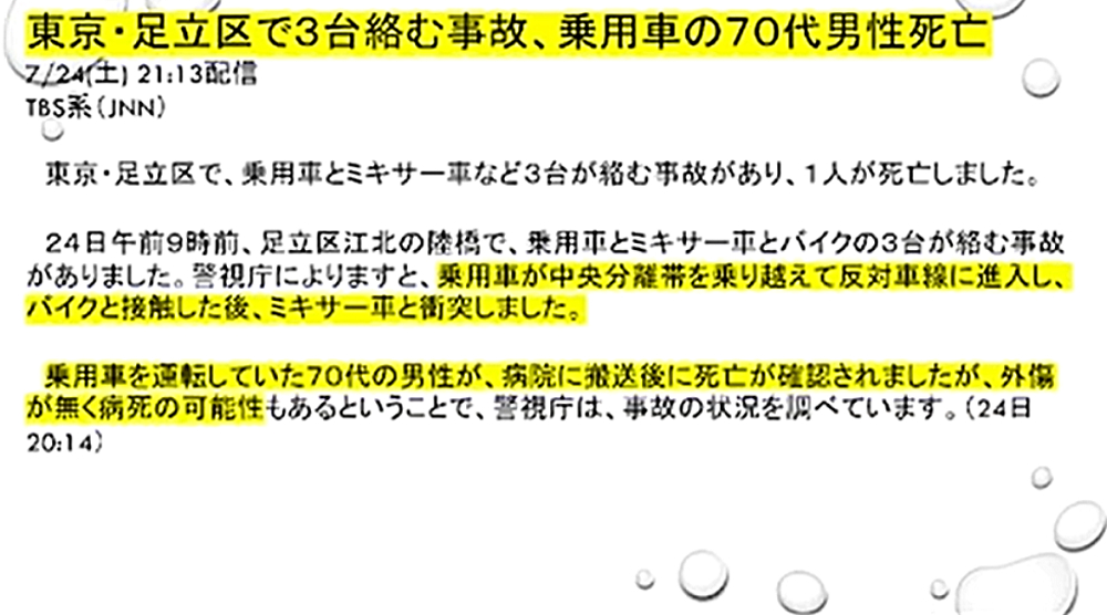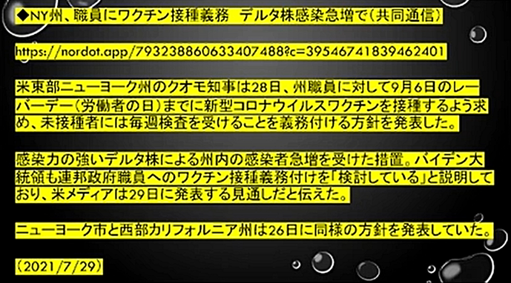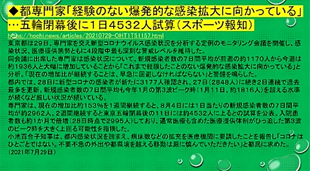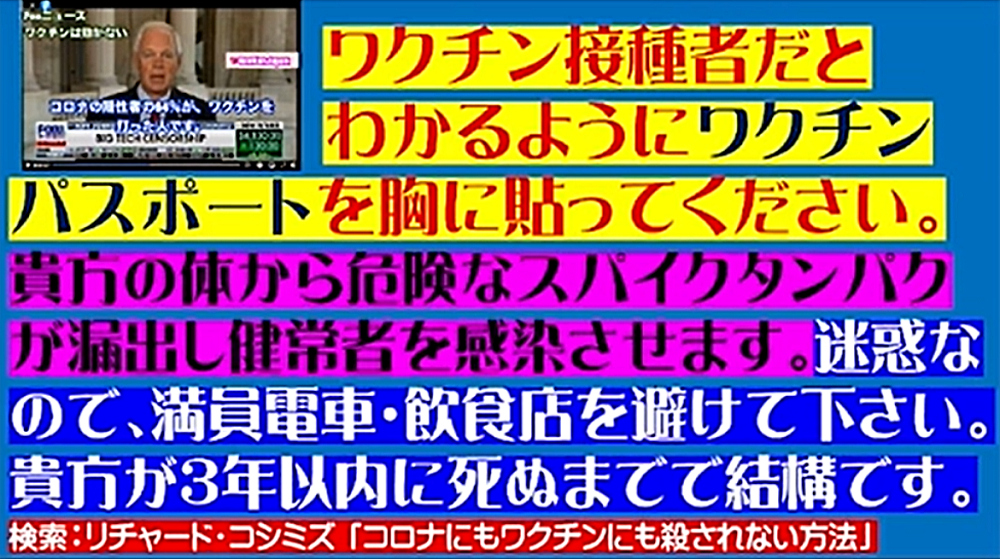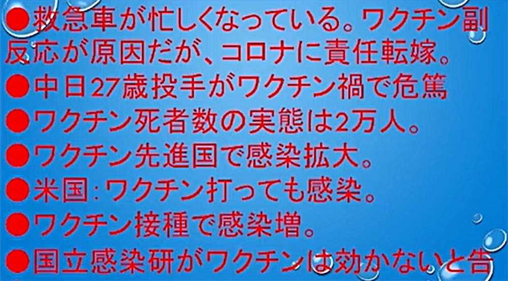 ◆新型コロナワクチン接種は感染予防にならず、むしろ、感染者数を増やしている。FOXニュース ◆イスラエルがネタニヤフの退任後、正常化している?新型コロナワクチン効果を否定する情報がイスラエルから。 ◆イスラエルの首相が公式に発表 「ワクチンの有効性は著しく低い」 ◆イスラエルのデータによると、新型コロナワクチンの接種に関わらず、感染者数は変わらない。興味深いのは、新型コロナワクチン接種者の入院患者数は感染者数とともに上昇しているが、新型コロナワクチン未接種者の入院患者数はあまり上昇していないということ。 ◆イスラエルのメディア:保健省のデータによると、新型コロナに自然感染して回復した人と比べて(再感染者72人)、新型コロナワクチン接種者で感染した人は、3,000人も存在し、40倍コロナが流行しやすい。 専門家見解:自然感染の免疫は、時間が経つと効果が失われるワクチンの免疫とは異なり、長期的な保護を提供する。 ◆「ファイザー社製ワクチンを2回接種したことにより、中和抗体の量が6分の1にまで減少」、英国フランシス・クリック研究所のディビッド・LV・バウアー博士が、TVインタビューで発言 ◆日本はオリンピック一色で報道していないが、フランスだけでなくEU全土にデモが拡大している。ワクチンパスポート反対のデモ、群衆は10万人以上。口々に「マクロン辞任せよ!」 ◆イタリアにおいても、フランスと同じように新型コロナワクチン強制接種反対の大規模抗議行動 ◆反コロナ規制、欧州各地でデモ ロックダウン・ワクチン反対 ◆フランス:「ワクチンパスポート」法案が可決 医療従事者のワクチン接種義務化へ ◆変異株感染者が増加はしているが、「だからといって、新型コロナワクチンを打たなければならない」という口実にはならない。ワクチンは効果がないどころか、コロナ感染を促進する。新型コロナは、イベルメクチンを週1回、12mg×1錠飲めば予防できる。賢い人は、皆、イベルメクチンを海外から個人輸入し、対応済みである。有害ワクチンの強要を行う政府のどす黒い目論見に気付いて下さい。 ◆スパイクタンパクとADE発症で、日本国民を殺すことが目的の新型コロナワクチンであるが、4,000万人がすでに接種済み。全く何も手当てをしなければ、3年以内に、皆、死んでしまう。ワクチン接種者間でじわじわと、死者・寝たきり者が増えていく。助かる方法はあるのに、気付いた頃には手遅れ。 ◆新型コロナワクチン接種後死亡例751件の死亡までの期間(7月21日開催厚生科学審議会ファイザーワクチン報告資料1-3-1より作成) ◆五輪の闇 想像以上 演出人事説明「全部ウソ」 ◆東京オリンピック = 東京統一教会オリンピック ◆東京五輪スタッフ、メディア関係者に「インチキ陰性判定」乱発か?検査スリ抜けこんなに簡単(日刊ゲンダイ) ◆ワクチン接種者だと分かるように、ワクチンパスポートを胸に貼って下さい。貴方の体から危険なスパイクタンパクが漏出し、健常者を感染させます。迷惑なので、満員電車・飲食店を避けて下さい。貴方が3年以内に死ぬまでで結構です。 ◆東京都足立区で3台絡む事故、乗用車の70代男性死亡 ◆首都高でトレーラー横転 道路ふさぐ 運転手ケガ ◆コロナ治療薬は、次々と開発されるが「なかった」ことにされる(厚生労働省は、コロナ治療薬をわざと認可しない)。殺人ワクチンを強制接種するために。 ◆超過死亡率で分かるワクチン死者の実数。コロナワクチンを接種したことにより死亡した人数が、隠されている。 ◆米国に不穏な空気。DEEP STATE裏社会の落日 |