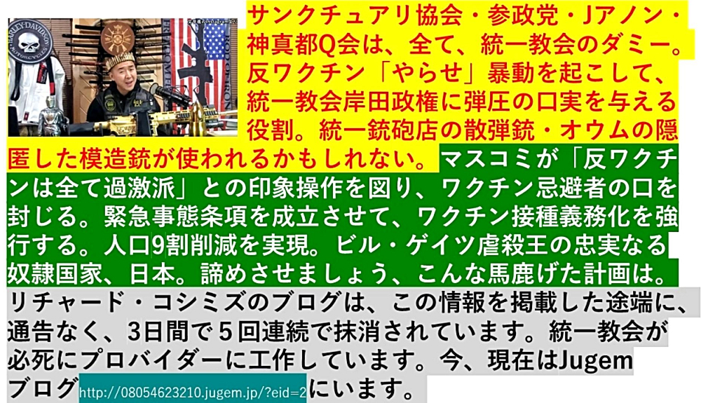 「『ワクチン大虐殺の本番』が始まった!『戦闘態勢』を整えましょう!」 ◐国民を「ワクチン接種」に慣れさせ、恐怖心・猜疑心を取り除くため、最初の2回は「プラセボか薄いワクチン」を打った。ワクチン接種者は、まんまと騙され、「ワクチンは安全だ」と信じ込んだ。3回目からが本物で、4回目以降は危険(ワクチンの粗製乱造)。 ◐死者の体から「血栓」が見つかる。「血栓症」での死者が多発する。車、航空機の運転者も。 ◐「ワクチン免疫不全症」で、「梅毒」激増。 ◐韓国で、過去39年間で最大の死者数。 ◐「オミクロン対応二価ワクチン・インフルエンザワクチン同時接種」から、「死者・寝たきり激増」と思われる。 ◐「インフルエンザワクチン」にも、「mRNAワクチンを投入」しようとしている。ダブルmRNA攻撃。劇症化。 ◐「5~11才の子供のワクチン接種」は、「将来の出生率の劇的な低減に繋がる人口削減策」の基本。 ◐「4歳以下のワクチン接種」を、「鬼畜厚生労働省は10月5日に認可」する。子供を重病化、殺してしまった母親は、一生、嘆き苦しむことになる。 ◐毒ワクチンを打たせるためには、ワクチン以外の「予防効果のある薬」が存在してもらっては困る。よって、富士フィルムや興和に手を回して、「アビガン・イベルメクチンは無効だ」との結論を引き出して封印した。厚生労働省の専門家部会も、完全に買収されている。 ◐「強毒性の内服薬・点滴薬」を流通させて、「軽症患者の薬殺」を進めている。今後、「ワクチン後遺症患者が激増」し、死者も多数出る。ワクチン接種への反対の声が大きくなる前に、「反ワクチン過激派」による暴動を捏造して鎮圧し、口を封じる作戦だった?先読みされて、出来なくなった?それとも、強行するか? ◐「ワクチン被害者」の激増で、自然に、「政府の陰謀」が世間に知れ渡る。 ◐「統一邪教・サンクチュアリ協会・参政党・ごぼうの党・ヤマトQ」の動向を注意深く監視する。 ◐統一教会一味の「やらせ反ワクチン」市民運動に騙されて、暴動に引き込まれないように。 ◐「イベルメクチンで充分戦える」と分かれば、誰もワクチンを打たなくなる。 ◐ロシアがノルドストリームを爆破した?ロシアの利益にならないのに?そんなバカげたことは、「ジョー・バイデン,ジョージ・ソロス」しかやらない。 ◐「ウォロディミル・ゼレンスキー,ジョージ・ソロス」によるロシア住民虐殺への対抗措置。 ◐そもそもウクライナ自体、元々「ロシアとほぼ同一民族」。ウォロディミル・ゼレンスキーも、最初は「対立を批判」。 ◐ウクライナは、ソ連建国時、「ユダヤ・ボルシェビキ政権」の都合で作られた国。「ハザール汗国」の分離を意図。ハザールを排除して、国丸ごと、ロシアに帰順すべき。 ◐「北朝鮮のミサイル発射・拉致」が問題ならば、なぜ、「北朝鮮と統一教会の『義兄弟』関係」を追及しないのか?なぜ国民は、この点を指摘しないのか?なぜ、マスコミは一切触れないのか?いい加減にしろ! |