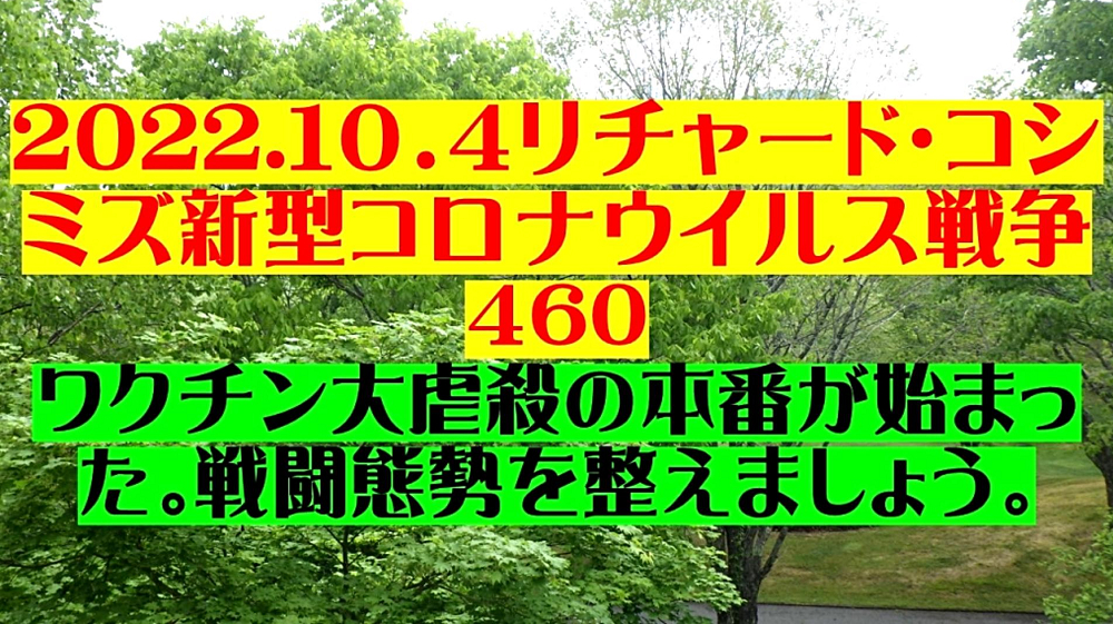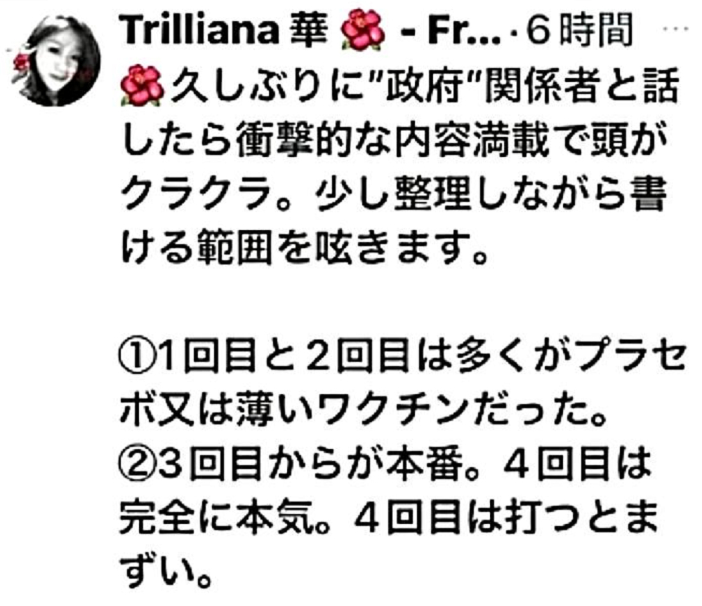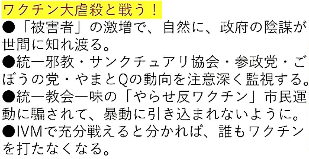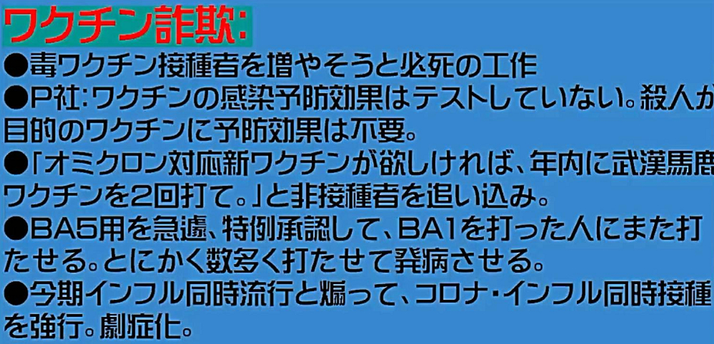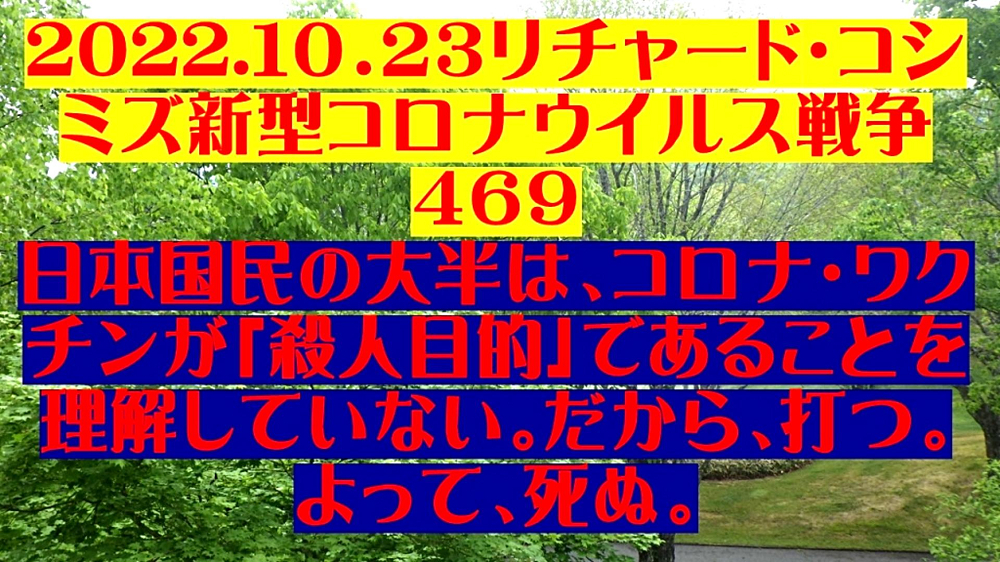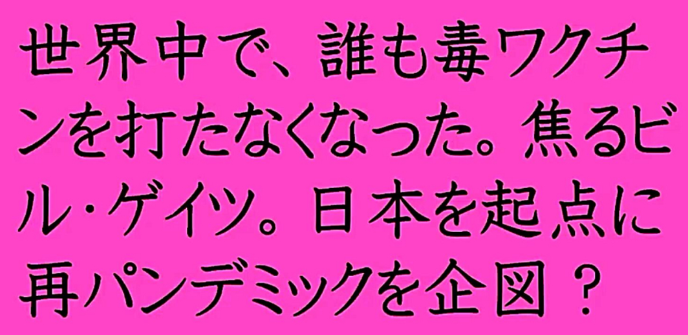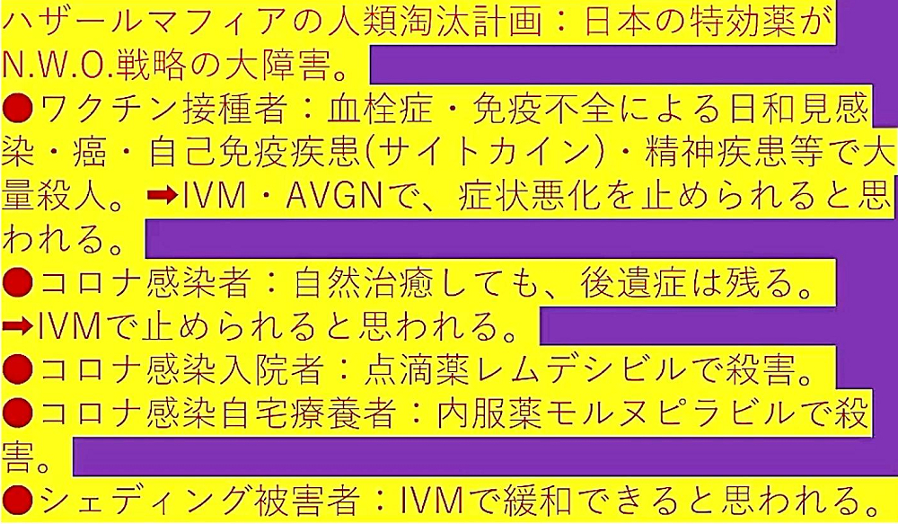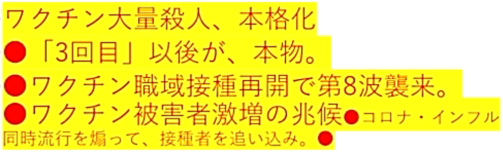 「日本国民の大半は、コロナ・ワクチンが『殺人目的』であることを理解していない。だから、ワクチンを打つ。よって、死ぬ!」 |