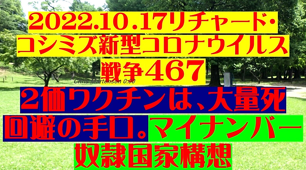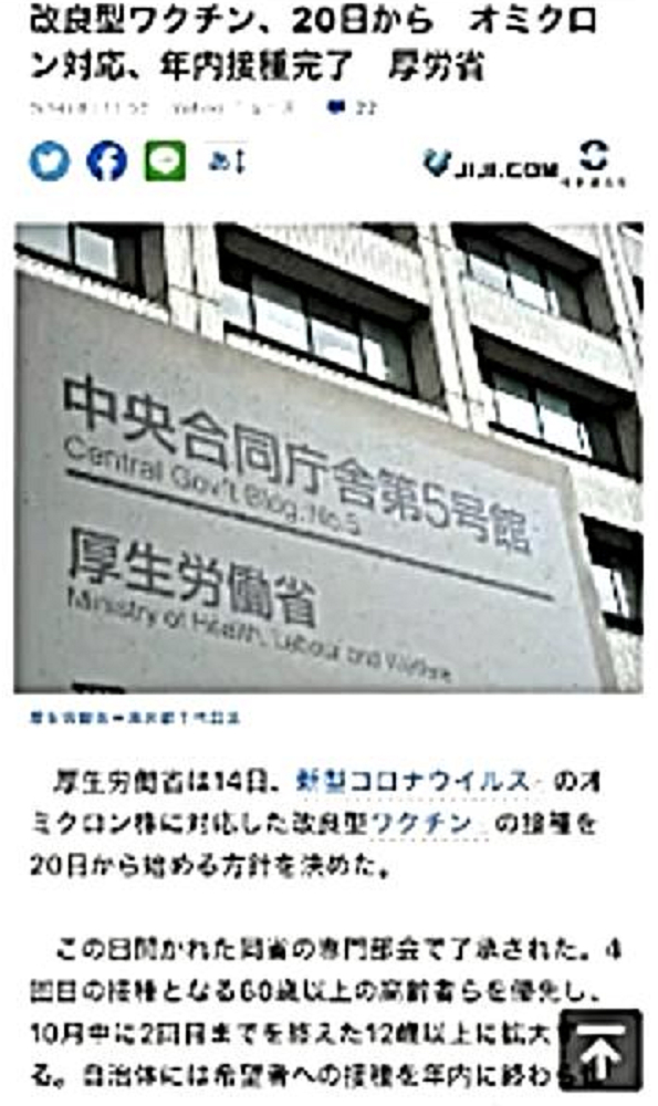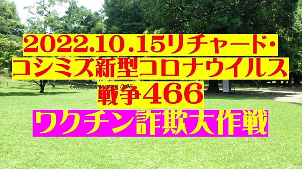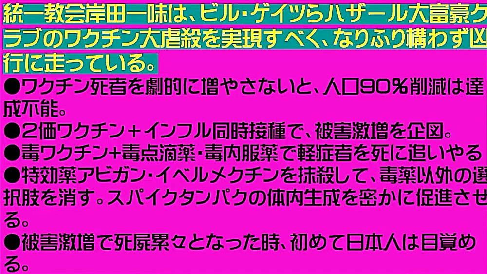 ◐「統一教会・岸田文雄一味」は、「ビル・ゲイツらハザール大富豪クラブのワクチン大虐殺」を実現すべく、なりふり構わず凶行に走っている。 ◐ワクチン死者を劇的に増やさないと、「人口90%削減」は達成不能。 ◐「2価ワクチン+インフル同時接種」で、被害激増を企図。 ◐「毒ワクチン+毒点滴薬・毒内服薬」で、軽症者を死に追いやる。 ◐「特効薬アビガン・イベルメクチンを抹殺」して、毒薬以外の選択肢を消す。スパイクタンパクの体内生成を密かに促進させる。 ◐「被害激増で死屍累々」となった時、初めて日本人は目覚める。 ◐「毒ワクチン接種者を増やそう」と必死の工作。 ◐P社:ワクチンの感染予防効果はテストしていない。「殺人が目的」のワクチンに予防効果は不要。 ◐「『オミクロン対応新ワクチン』が欲しければ、年内に『武漢馬鹿ワクチンを2回打て』!」と非接種者を追い込み。 ◐BA5用を急遽、特例承認して、BA1を打った人にまた打たせる。とにかく、数多く打たせて発病させる。 ◐「今期インフル同時流行」と煽って、「コロナワクチン・インフルエンザワクチン同時接種」を強行。劇症化。 ◐ワクチン接種で「脳疾患」に。 ◐コロナ後遺症で「認知症」に。 ◐「情報弱者」が「ワクチン接種」で殺される。 ◐「毒薬パクスロビド」で血栓症に。 ◐「富士フイルム、アビガンを放棄」。「ビル・ゲイツの大虐殺」に協力。 ◐タダで旅行したかったらワクチン打て。 |