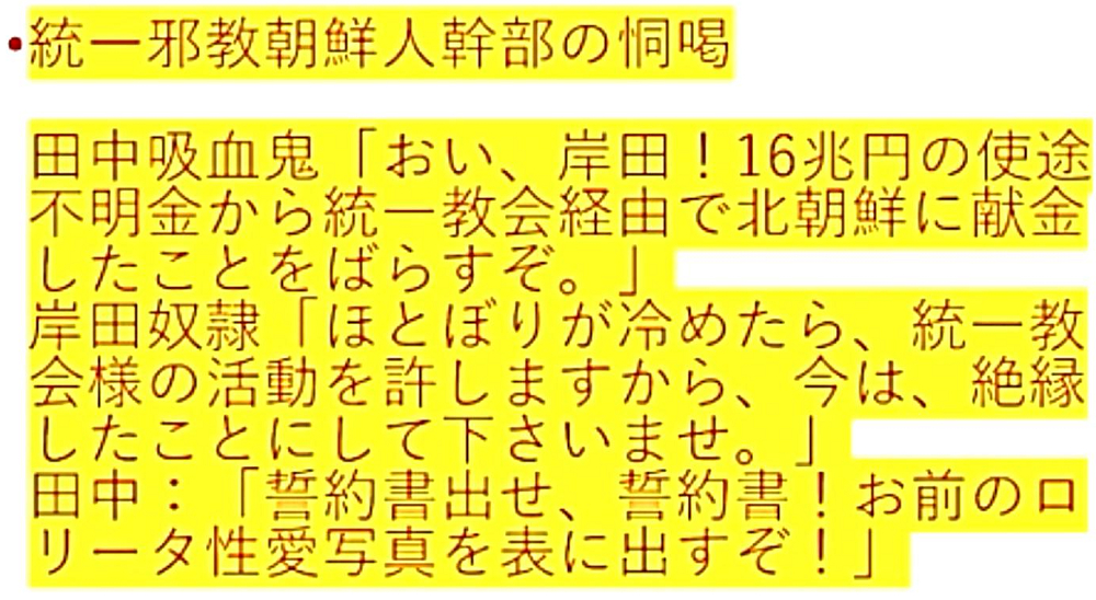 「おい、岸田!『16兆円の使途不明金』から、『統一教会経由で北朝鮮に献金』したことをばらすぞ!」 ◆岸田文雄奴隷 「ほとぼりが冷めたら、『統一教会様の活動を許します』から、『今は、絶縁したことにして下さいませ!』」 ◆田中吸血鬼 「誓約書出せ、誓約書!お前の『ロリータ性愛写真』を表に出すぞ!」 |