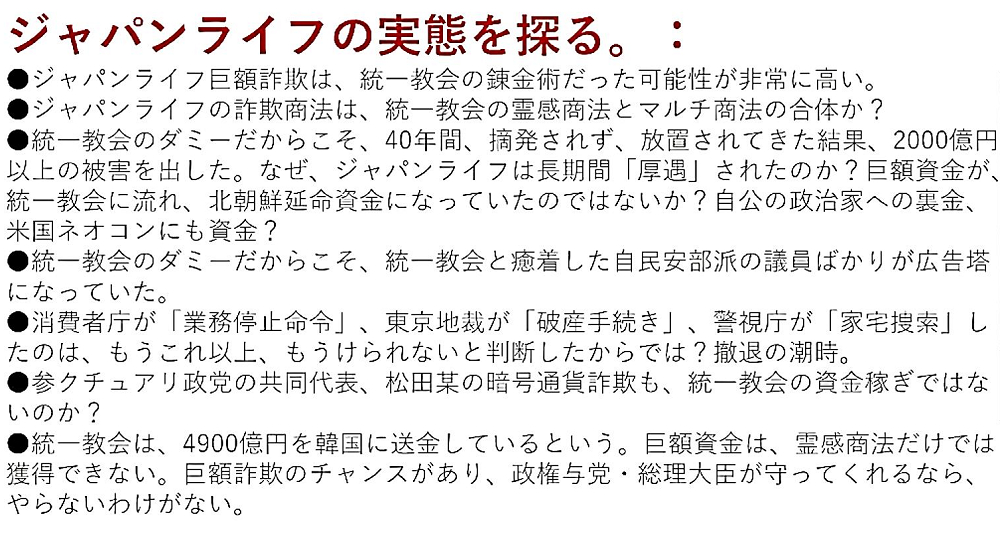 「『ジャパンライフは、統一教会の詐欺事業』。だから、『安倍晋三・下村博文・加藤勝信』が広告塔に。40年間摘発されず。習近平は、『ジョージ・ソロスらの暗殺・クーデター計画』を阻止し、今後10年独裁体制を確立した?『11月8日、米国中間選挙でドナルド・トランプ共和党大勝』。ウクライナ停戦へ。テロ警戒」 ◐「ジャパンライフ巨額詐欺」は、「統一教会の錬金術」だった可能性が非常に高い。 ◐「ジャパンライフの詐欺商法」は、「統一教会の霊感商法とマルチ商法」の合体か? ◐「統一教会のダミー」だからこそ、40年間、摘発されず、放置されてきた結果、2000億円以上の被害を出した。なぜ、ジャパンライフは、長期間「厚遇」されたのか?巨額資金が、「統一教会に流れ、北朝鮮延命資金」になっていたのではないか?「自民党・公明党の政治家」への裏金、「米国ネオコン」にも資金? ◐「統一教会のダミー」だからこそ、統一教会と癒着した「自民党安部派の議員」ばかりが広告塔になっていた。 ◐消費者庁が「業務停止命令」、東京地裁が「破産手続き」、警視庁が「家宅捜索」したのは、もうこれ以上、もうけられないと判断したからでは?撤退の潮時。 ◐サンクチュアリ政党の共同代表、松田某の暗号通貨詐欺も、「統一教会の資金稼ぎ」ではないのか? ◐「統一教会は、4900億円を韓国に送金」しているという。巨額資金は、霊感商法だけでは獲得できない。巨額詐欺のチャンスがあり、「政権与党・総理大臣」が守ってくれるなら、やらないわけがない。中国で「ジョージ・ソロス」主導の政変劇? ◐北京で、軍が厳戒態勢にあった可能性が高い。 ◐習近平が「雲隠れ」。「暗殺回避」が目的か?その後、影武者登場?党大会では、本物登場。 ◐「ジョージ・ソロス」が、「反習近平派」を糾合して、習近平の「3期目」を阻止しようとした? ◐習近平が陰謀を看破し、「反対派を一斉排除」。「胡錦涛・李克強」も追放。 ◐米国ハザール・マフィアと癒着した「江沢民」は、出席すらせず。 ◐「ジョージ・ソロス」は、「習近平を『敵』」と公言し、攻撃してきた。香港の暴動に、「ウクライナのネオナチ暴力団」を送り込んでいる。2022年党大会に合わせて、「習近平の引きずり降ろし工作」を企み、「失敗」したと見る。 ◐「習近平」は、「ハザール・マフィアによる姦計」を見破り、反対派を一斉に粛清して、党幹部を身内で固めた。それにより、今後5~10年間の円滑な国家運営を企図していると見る。ハザールの影響力を一気に排除したことで、「プーチンロシアとの連携関係は前進する」であろう。ジョージ・ソロス、呆然自失。 ◐「11月8日米国中間選挙」で、上下院とも、ドナルド・トランプ共和党の勝利公算大(「不正選挙」は、非常にやりにくい状況)。2024年、「ドナルド・トランプ大統領誕生」が決まってしまう。 ◐米国共和党勝利で、「ジョー・バイデン」は、予算・外交で無力化。金が自由にならない。「ウクライナ戦争が続けられない」。 ◐「ウクライナへの武器供与」が止まる。ロシア軍、11月に大攻勢へ。「ウォロディミル・ゼレンスキー」、敗北へ。 ◐「ジョージ・ソロス」の仇敵、「習近平・プーチン・トランプ」の3人ともが、権力基盤を確立。「ジョージ・ソロス」には、対抗手段がない。よって、「核テロ・汚い爆弾テロ」を行い、ロシアに罪を擦り付けるなどの「最後の抵抗」に出るか? ◐「米国の国家デフォルト問題の契機」となるか?(破綻後に、「ドナルド・トランプ」登場) |