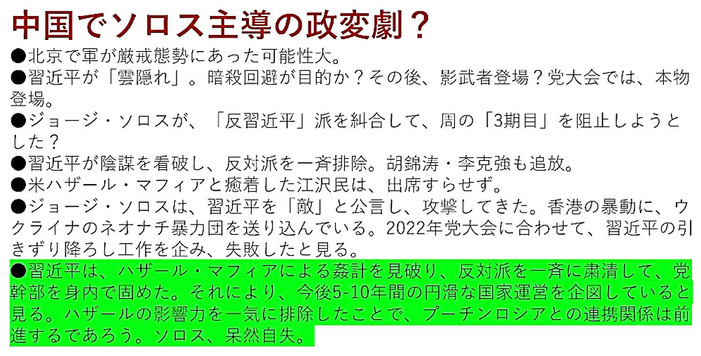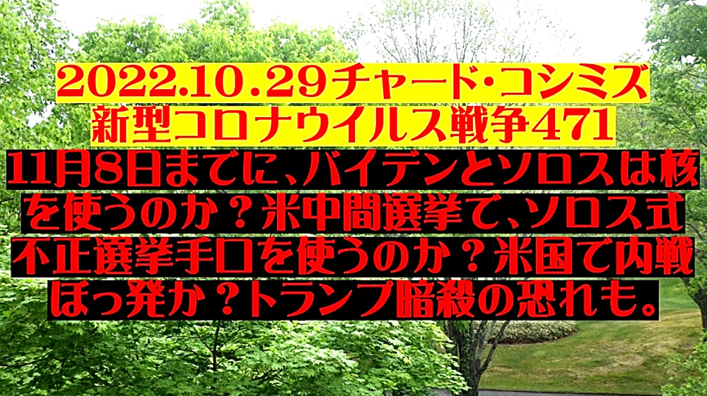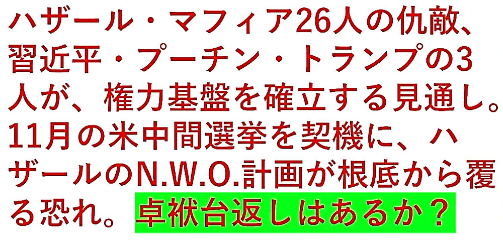 「『11月8日までに、ジョー・バイデンとジョージ・ソロスは核を使うのか?』・『米中間選挙で、ジョージ・ソロス式不正選挙手口を使うのか?』・『米国で内戦ぼっ発か?』・『ドナルド・トランプ暗殺の恐れも』」 ◐「ハザール・マフィア26人の仇敵」、「習近平,ウラジーミル・プーチン,ドナルド・トランプ」の3人が、権力基盤を確立する見通し。 ◐11月の米中間選挙を契機に、「ハザール・マフィアのN.W.O.計画が根底から覆る」恐れ。卓袱台返しはあるか? |