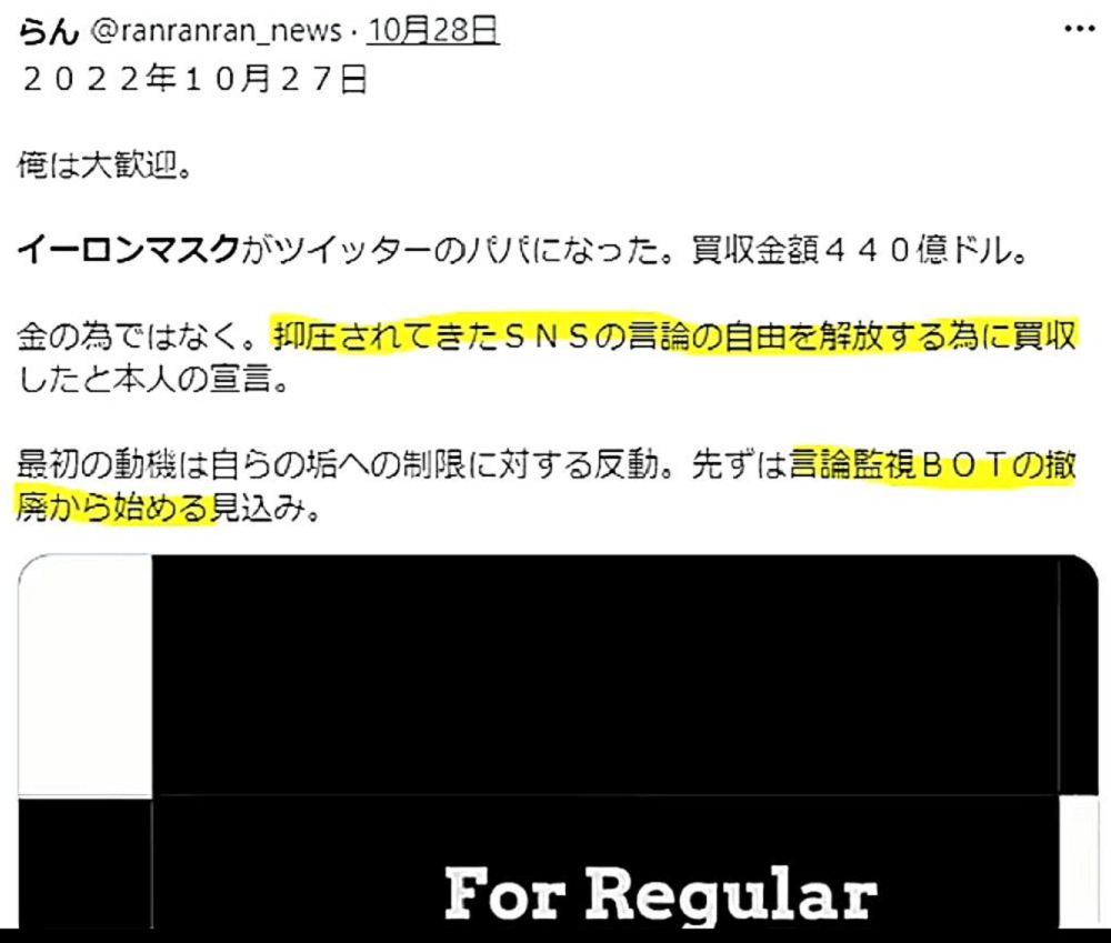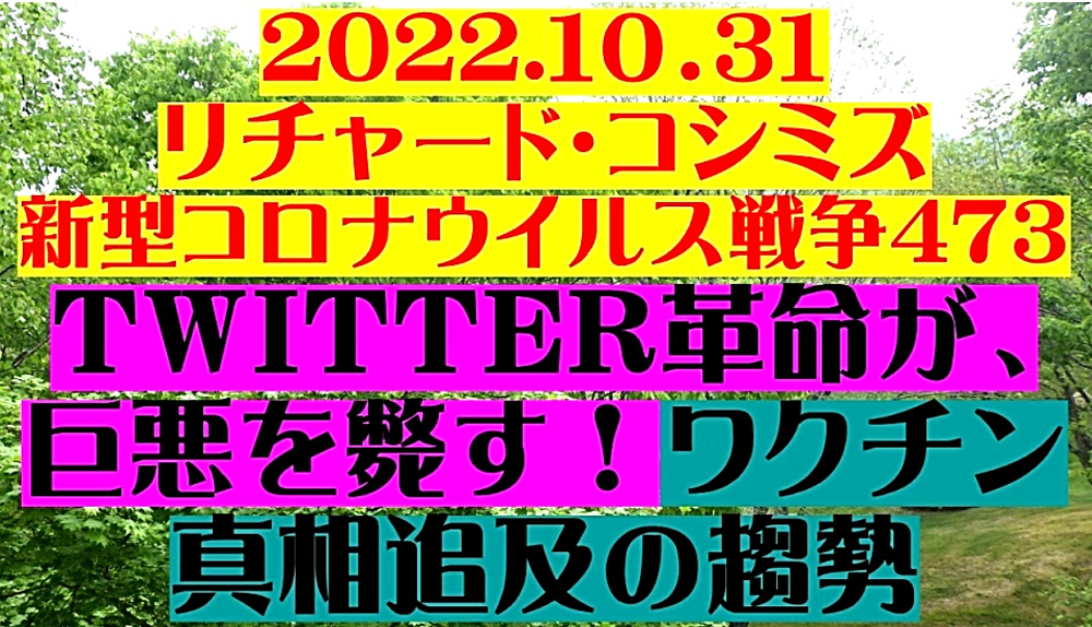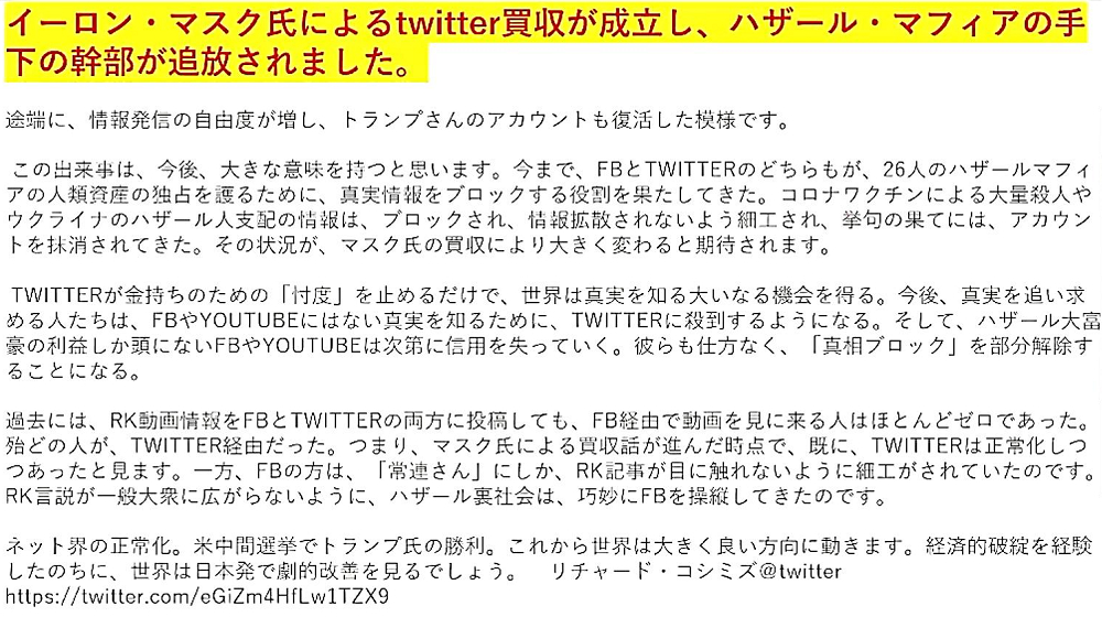 「『TWITTER革命が、巨悪を斃す!』・『ワクチン真相追及の趨勢』」 ◐「イーロン・マスク氏」が「Twitterを買収」したら、何がどう変わるのか? ◐「イーロン・マスク氏Twitter買収」で起きる重大変化を嫌って、ハザールマフィアが「マスク氏の抹殺」を企むことを非常に危惧します。 ◐Twitterに巣食っていた「ハザール傀儡幹部」が一斉に断頭され、言論統制が一気に解除された。 ◐「ドナルド・トランプ寄りのイーロン氏」をブロックしたTwitterが、「中間選挙」直前にイーロン氏に「帰順」したことで、ジョー・バイデン民主党は、真っ青。 ◐Twitterは「買収劇」で、民主党の拡声器から、反民主党の牙城に衣替えする! ◐Twitterの「思想警察」が解雇された!Facebook/Twitterが徹底して隠してきた「真相」が、どこまで、「新生Twitter」によって、世界に伝播されるか?「不正選挙もウクライナもコロナも」! ◐「救世薬 イベルメクチン」を、Twitter経由で世界に知らしめることができる!コロナワクチンを排除できる!「コロナ人口削減計画」が発覚する! ◐Twitterがハザールマフィアの拡声器を「辞退」すれば、残った拡声器の「Facebook・YouTube」等は、「思想警察」の機能を維持できなくなる。Twitterに阿て、懐柔しようと企む歯抜けの「マーク・ザッカーバーグ」。 ◐「ドナルド・トランプ氏」も、「イーロン・マスク氏の買収を歓迎」。民主党は真っ青。 ◐Twitter経由で、「ピザゲート事件の真相」が暴かれる。「エプスタイン島のコロナ人体実験」疑惑も。ワクチン真相追及の趨勢! |