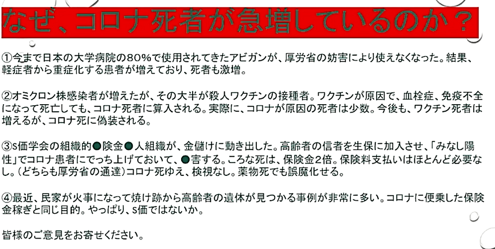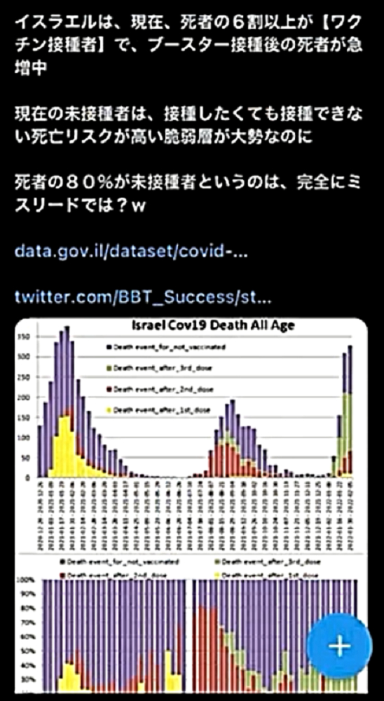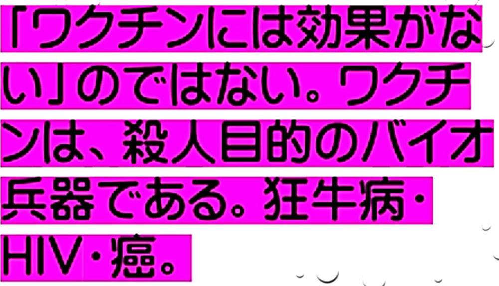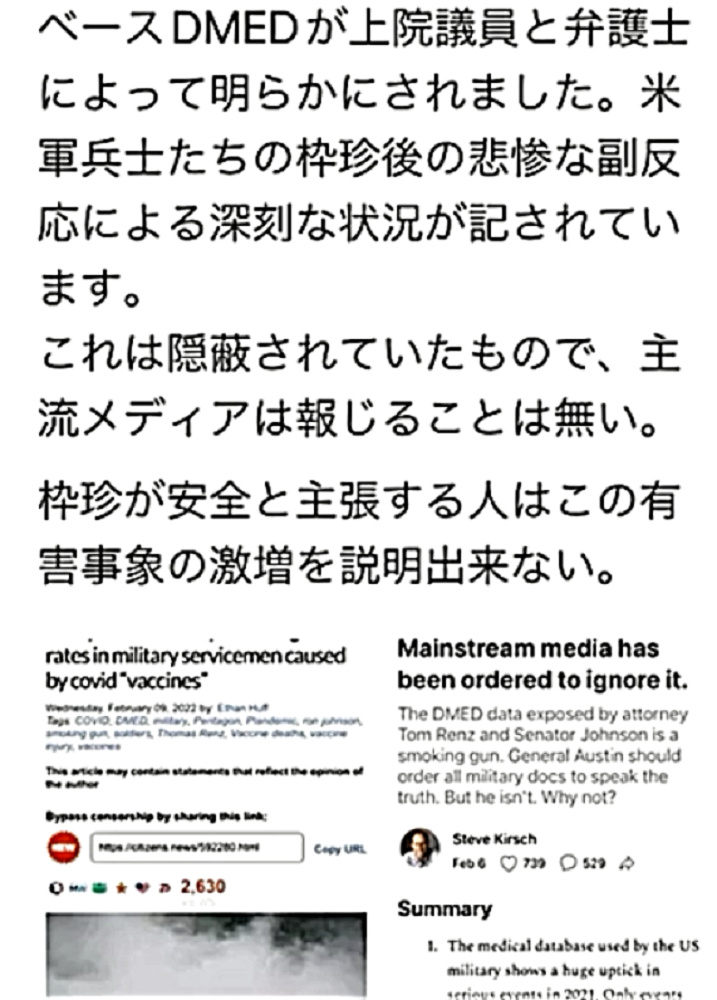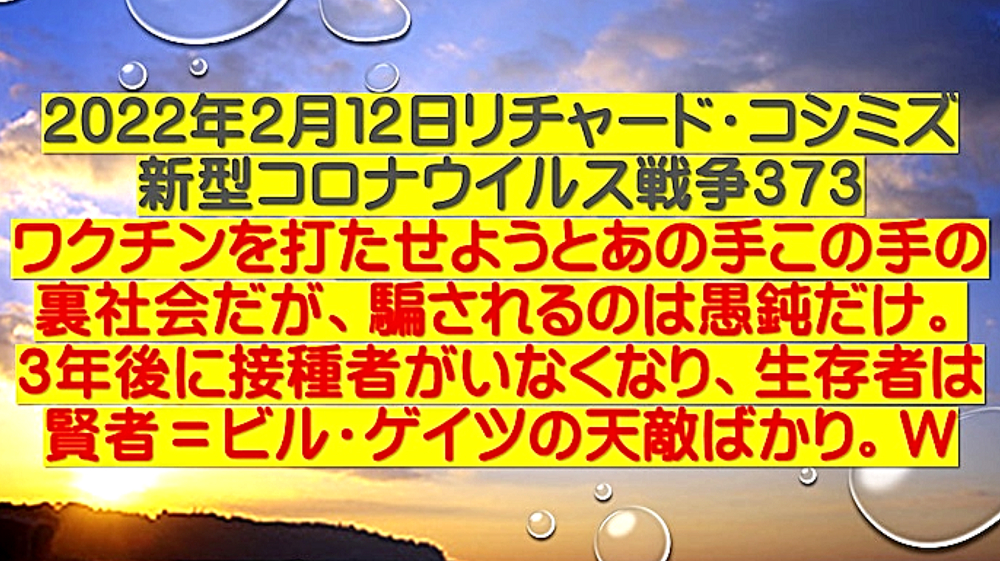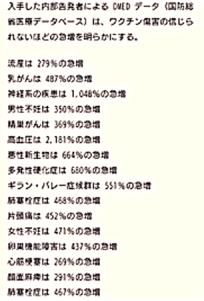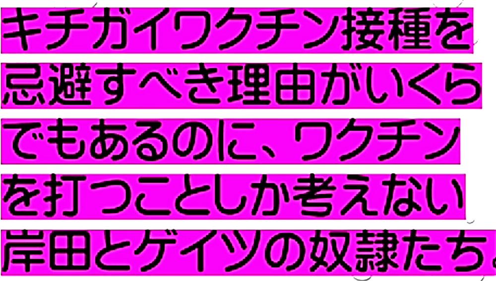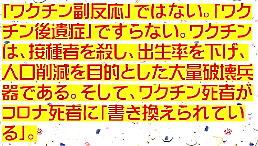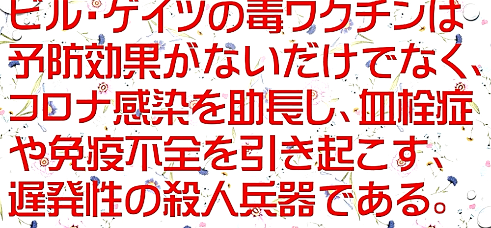 「『ワクチンを打たせようとあの手この手のDEEP STATE裏社会』だが、騙されるのは愚鈍だけ。3年後にワクチン接種者がいなくなり、生存者は『賢者=ビル・ゲイツの天敵』ばかりW」 ◆統一教会・創価学会在日カルトの対立? ・殺人ワクチンの主導権? ・麻薬利権の奪い合い? ・統一教会失権? ・創価学会不正選挙の動向 ◆公明党が今夏の参院選で自民党候補者「推薦否定」の衝撃 ◆ビル・ゲイツの毒ワクチンは予防効果がないだけでなく、コロナ感染を助長し、血栓症や免疫不全を引き起こす、遅発性の殺人兵器である。 ◆ブースター接種がクラスター発生の原因である。 ◆子供はワクチン接種で死屍累々。 ◆ワクチン接種済みの母親、死産続出。 ◆子供のワクチン接種死を見越して、「努力義務」を解除。 ◆ロバート・ウォレス・マローン博士(mRNAワクチンの発明者) 「いかなる状況下であっても、決してこのワクチンを接種してはならない」 ◆リュック・アントワーヌ・モンタニエ博士(ウイルスの研究でノーベル賞受賞) 「ワクチンの大量接種は、とんでもない過ちである。科学的な誤りであると同時に、医学的な誤りでもある。受け入れがたい過ちだ。なぜなら、ワクチン接種が変異株を生み出しているのだから」 ◆ギアート・バンデン・ボッシュ博士 「生来の免疫機能が毀損する。すぐにワクチン接種をやめろ!」 ◆キャリー・バンクス・マリス博士(PCR検査の発明者 ノーベル賞受賞) 「連中は間違った使い方をしている。PCRを感染症に使ってはならない」 ◆マイケル・イードン博士(元ファイザー副社長) 「ワクチン接種を行うと、数年内に死にます。政府が嘘をつくのは、あなた方を殺すためです」 ◆リー・メリット博士(米海軍の生物兵器研究者) 「新型コロナワクチンは、完全に『生物兵器』である」 ◆日本もイスラエルや韓国と同じ傾向である。ブースター接種者が感染の温床となり、集団大量感染を発生させている。大阪の病院では、「実はですね、院内でクラスターが発生していまして...3回目のワクチンを接種した職員が30人感染し、他にも40人の患者が感染」 ◆イスラエルは現在、死者の6割以上が「ワクチン接種者」で、ブースター接種後の死者が急増中。 ◆ダニエル・ナガセ医師 「カナダで死産が急増!母親は完全にワクチン接種済み」 ◆ペンタゴンの国防医療疫学データベース(DMED)が、上院議員と弁護士によって明らかにされた。米軍兵士たちのワクチン接種後の悲惨な副反応による深刻な状況が記されている。これは隠蔽されていたもので、主流メディアは報じることは無い。「ワクチンが安全」と主張する人は、この有害事象の激増を説明できない。 |