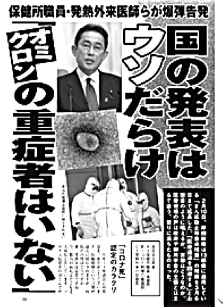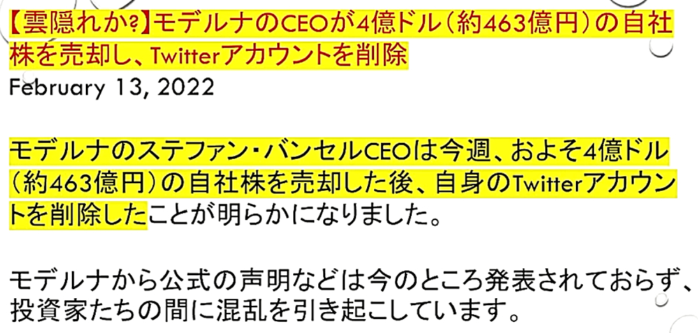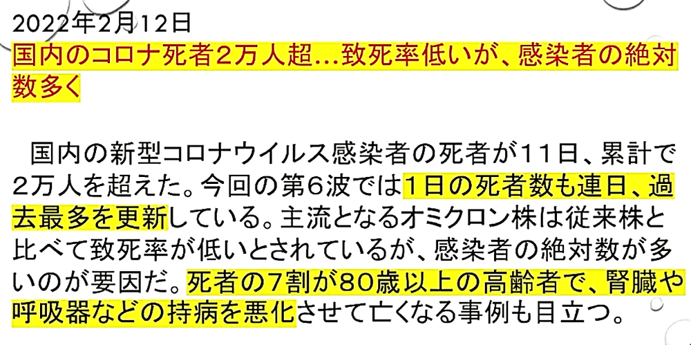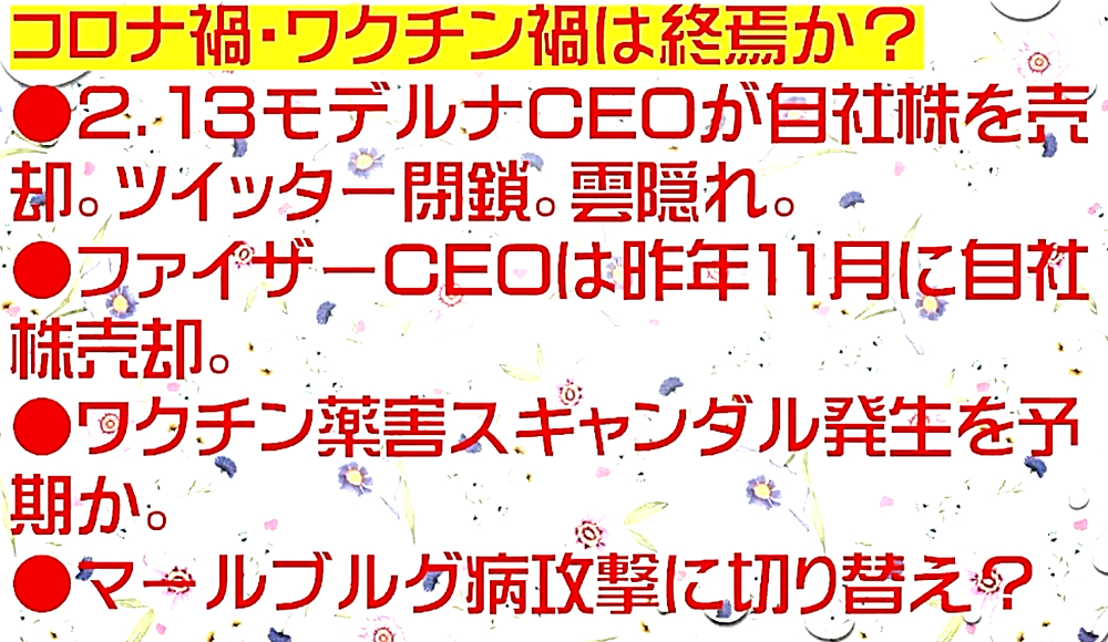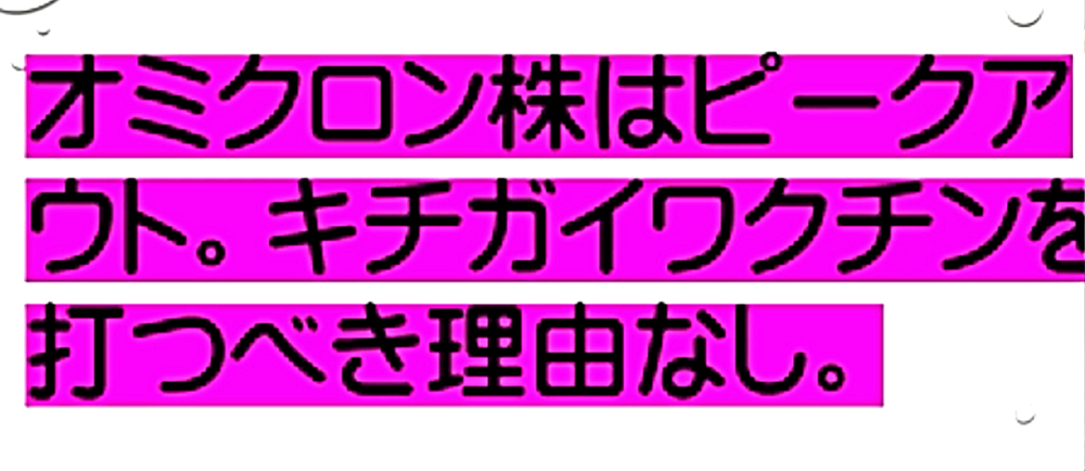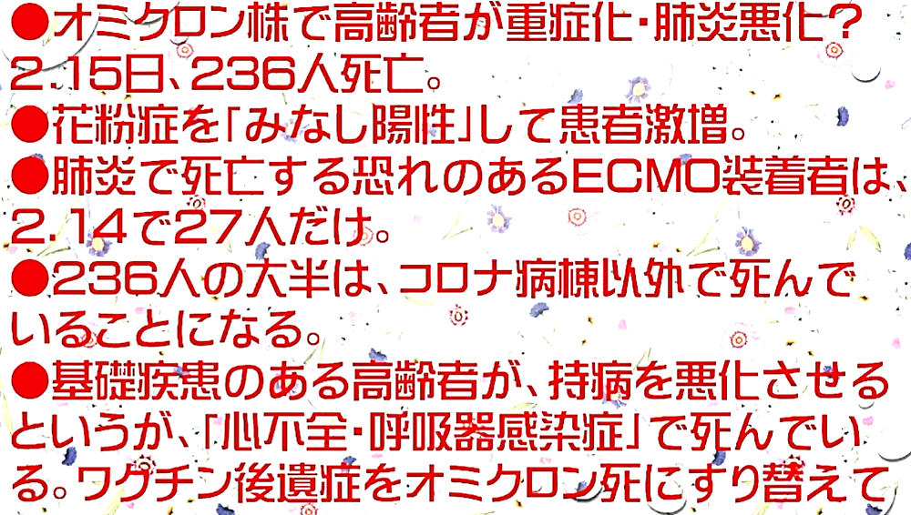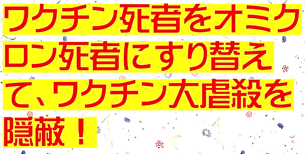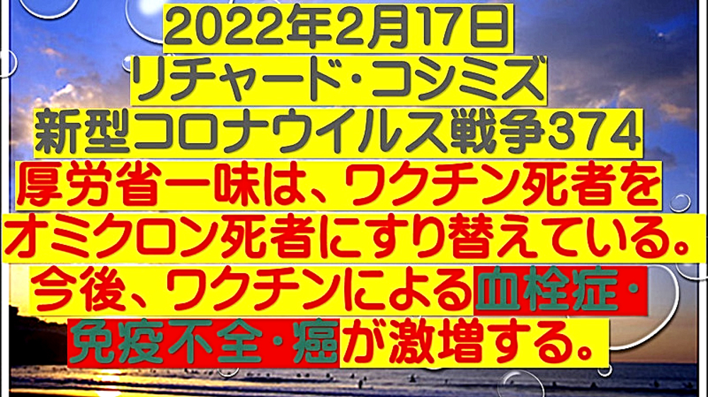「『厚生労働省一味は、ワクチン死者をオミクロン死者にすり替えている』。今後、ワクチンによる『血栓症・免疫不全・癌』が激増する」 ◆ワクチン接種死者をオミクロン死者にすり替えて、ワクチン大虐殺を隠蔽している! ◆オミクロン株で高齢者が重症化し、肺炎が悪化している?2月15日、過去最多の236人死亡が報告されたが、本当にオミクロン株による患者が増えているのか、大いに疑わしい。 ◆花粉症を「みなし陽性」にして、感染者患者激増。 ◆肺炎で死亡する恐れのあるECMO装着者は、2月14日で27人だけ。 ◆236人の大半は、コロナ病棟以外で死んでいることになる。 ◆基礎疾患のある高齢者が、持病を悪化させるというが、「心不全・呼吸器感染症」で死んでいる。ワクチン後遺症をオミクロン死にすり替えている。 ◆新型コロナ 死者236人 一日の発表では最多に(2022年2月15日) ◆日本国内のコロナ死者2万人超...致死率低いが、感染者の絶対数多く ◆「見分けるのが難しい」花粉症とオミクロン株の症状が類似...「みなし陽性」増加の可能性も ◆全国で新たに9万人超感染 花粉症でみなし陽性増加 ◆日本国内のCOVID-19におけるECMO治療の成績累計(2022年2月14日) ◆オミクロン株で高齢者が重症化 肺炎悪化、都内の病床逼迫の懸念<新型コロナ> ◆大曲貴夫 国立国際医療研究センター国際感染症センター長は、「コロナ感染で体力を失い、心不全や老衰で亡くなる患者もいる」と話す。 ◆なぜ、コロナ死者が急増しているのか? ◆10代学生死亡、基礎疾患なし コロナ感染、さいたま市 「市は死因を、血管内で血栓が多発する播種性血管内凝固症候群とみている」 ◆新型コロナワクチン接種後に全身機能低下。寝たきりで休職している現状を取材 ◆コロナ禍・ワクチン禍はもうすぐ終焉か? ◆2月13日、モデルナCEOが自社株を売却し、ツイッターを閉鎖し、雲隠れ。 ◆ファイザーCEOは、昨年11月に自社株を売却。 ◆モデルナ・ファイザーは、今後、ワクチン薬害スキャンダルが発生することを予期し、自社株を売却したのか? ◆「新型コロナワクチンテロ」は失敗する可能性が非常に高くなってきたため、「マールブルグ病」攻撃に切り替える? |