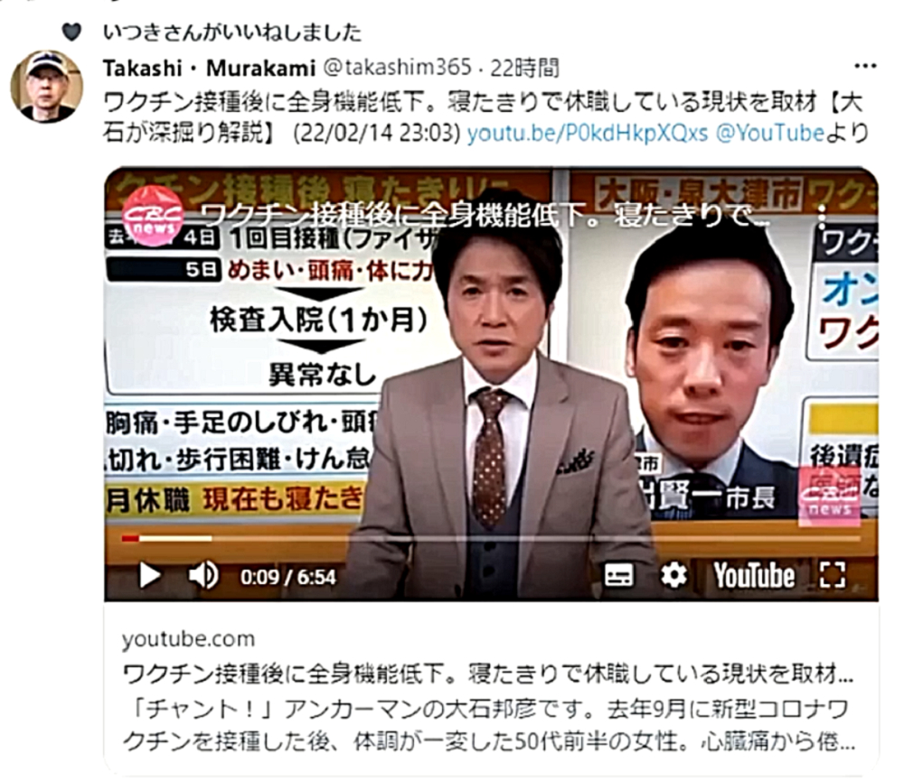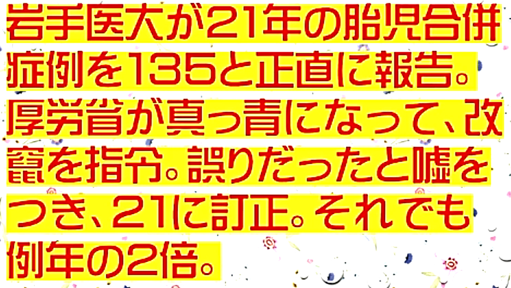 ◆岩手医科大学が、2021年の胎児合併症例を135と正直に報告してしまった。厚生労働省は真っ青になり、改竄を指令し、誤りだったと嘘をつき、21例に訂正。それでも例年の2倍の症例数。 ◆新型コロナワクチンで「胎児合併症」急増は誤り 岩手医大病院が声明、SNSで憶測拡散 ◆主な治療実績:2013年4月に新規周産期医療情報管理システム移行後の実績 ◆ビル・ゲイツ毒ワクチンが、妊婦・胎児に影響があるのは確定した事実である。母親のスパイクタンパクが、胎児に移行するのである。よって、テロリスト厚生労働省は、「ワクチン薬害の発覚」を極度に恐れている。 ◆米国上院のパネルディスカッション。弁護士が内部告発者によって提供されたアメリカ国防総省(ペンタゴン)もデータを明らかに。「ワクチン接種後、流産と癌は過去1年間で、5年間の平均よりも300%増加。神経学的問題は1000%増加した」 ◆ファイザー社の元副社長科学主任だった「マイケル・イードン博士」が、EU(欧州連合)にワクチン試験を即刻停止するように要請:「新型コロナワクチンは、『無期限の不妊症』を引き起こす懸念がある」 ◆入手した内部告発者による国防総省医療データベースは、ワクチン傷害の信じられないほどの急増を明らかにしている。 ◆「ワクチン副反応」ではない。「ワクチン後遺症」ですらない。ワクチンは接種者を殺し、出生率を下げ、人口削減を目的とした大量破壊兵器である。そして、ワクチン死者がコロナ死者に書き換えられている。 ◆3回目接種「どんどん打って」 堀内ワクチン担当相 ◆ワクチン薬害に関する刑事告発 「殺人罪・殺人未遂罪・業務上過失致死傷罪・公務員職権濫用罪告発事件」 ◆コロナより怖い!世界中の医師・科学者達が命懸けで警告!「ワクチン後遺症・コロナワクチン接種直後の副反応・発熱・倦怠感だけではない!3回目接種、子どもに接種させる前に知っておきたいコロナワクチンに潜むリスク!」 ◆保健所職員・発熱外来医師らが爆弾告発 「国の発表はウソだらけ オミクロンの重症者はいない」、コロナ死認定のからくり |