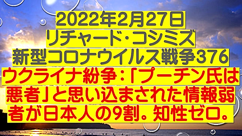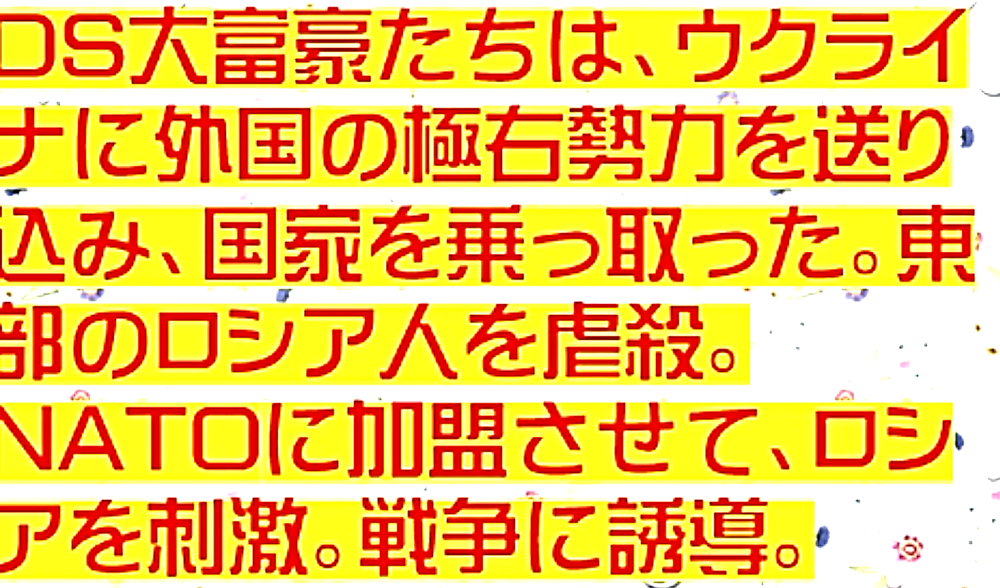 「ウクライナ紛争:『ウラジーミル・プーチン氏は悪者』と思い込まされた情報弱者が日本人の9割。知性ゼロ」 ◆DEEP STATE大富豪たちは、ウクライナに外国の極右勢力を送り込み、国家を乗っ取った。そして、東部のロシア系住民を虐殺し、NATOに加盟させ、ロシアを刺激し、戦争に誘導しようとしている。 ◆DEEP STATE大富豪たちが使う手先は、いつの時代もクズの中のクズ。麻薬まみれ、汚い金まみれの暴徒。日本も同じ。ただし、騙された情報弱者のおじいちゃんたちも参加。 ◆DEEP STATE勢力は、旧ハザール王国再興のために、①.チェルノブイリテロ ②.オウムロシア謀略 ③.オレンジ革命 ④.ロシア系虐殺・NATO加盟。 ◆日本のメディアは、「ロシアの侵略」としか伝えない。「ウクライナがDEEP STATEの傀儡である」ことを伝えない。プーチン氏を一方的に悪者に。同じ手口で、殺人ワクチンを国民に強要する。日本のメディアは、DEEP STATEの代理店。兵器で国民を騙し殺す。 |