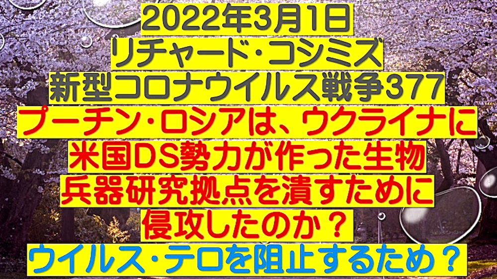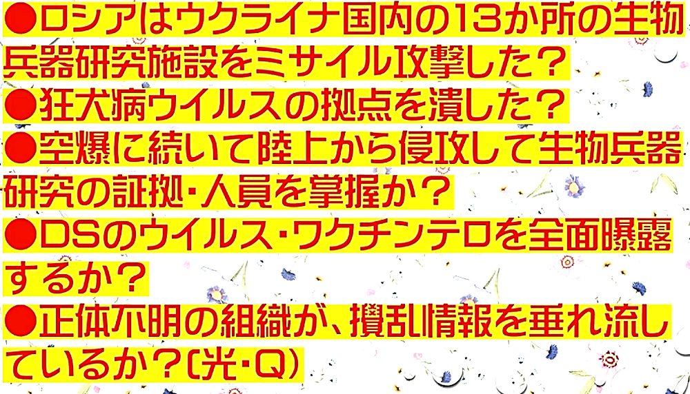 「プーチン・ロシアは、ウクライナに米国DEEP STATE勢力が作った生物兵器研究拠点を潰すために 侵攻したのか?ウイルス・テロを阻止するためなのか?」 ◆ロシアは、ウクライナ国内の13か所の「生物兵器研究施設」をミサイル攻撃したのか? ◆狂犬病ウイルスの拠点を潰したのか? ◆空爆に続いて陸上から侵攻して、生物兵器研究の証拠・人員を掌握か? ◆DEEP STATEのウイルス・ワクチンテロを全面曝露するか? ◆正体不明の組織が、攪乱情報を垂れ流しているか?(光・Q) ◆プーチン・ロシアは、ウクライナ東部のイスラエル系「空中狂犬病」研究施設を壊滅させた? ◆日本の厚生労働省が理由もなく、アビガンの認可をしなかったのは、新型コロナの次に空気感染する狂牛病を流行させる「予定」があったからでは? ◆日本政府のアビガン200万人分備蓄とは、狂犬病で人類の大半を殺戮する際に、DEEP STATE100万人だけが生き残る手段? ◆プーチン氏は他国侵略の汚名を被って、狂犬病による人類淘汰計画を阻止してくれた?(マールブルグ病もアビガンで阻止できる) ◆日本のメディア・政治家は、DEEP STATEハザール大富豪の言いなりである。よって、何のためらいもなく、プーチン批判。 ◆「コロナ禍は、人為的なテロ」・「殺人ワクチンで人類の大半を淘汰」・「911・311・オウム事件」のすべてで、DEEP STATE大富豪の勢力が暗躍している。コロナ禍ももちろん、同一勢力の仕業である。 ◆ウクライナは、DEEP STATE勢力に最後に残った生物兵器の拠点である。次のバイオテロを阻止するために、プーチン氏が軍事行動に出てくれた! |