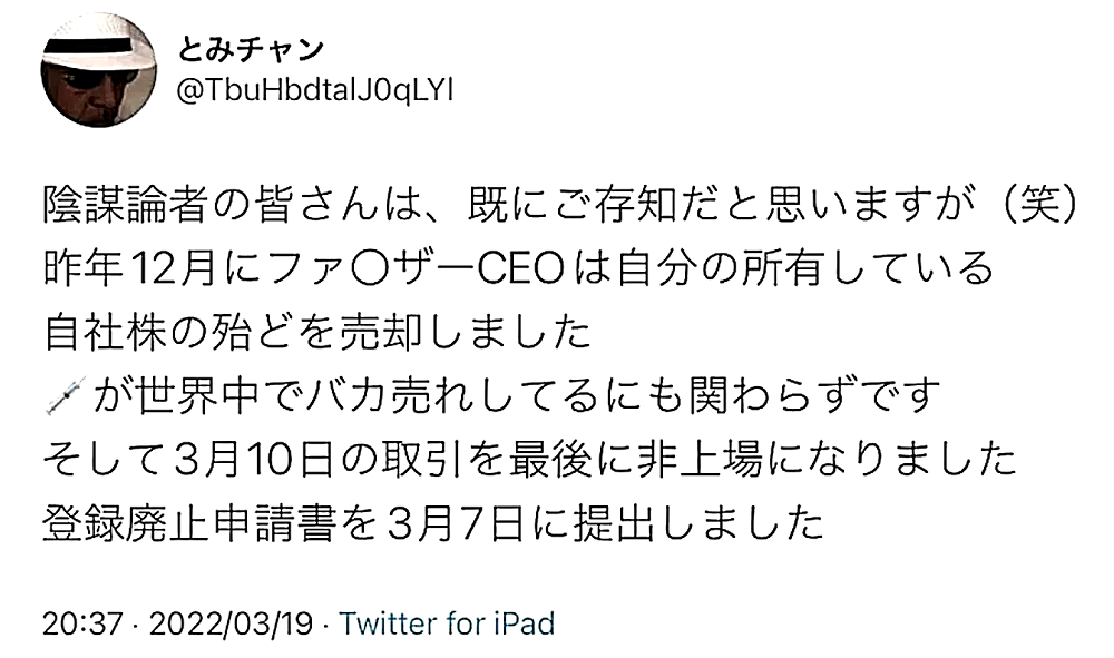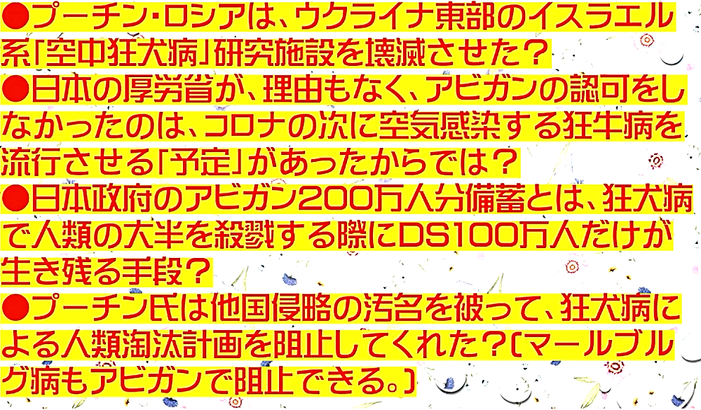 「『ウクライナ紛争は、プーチン・ロシアによる侵略ではない』と知る人が増えてきた。DEEP STATE裏社会とマスコミは、必死にプーチン攻撃」 ◆この戦争は断じて、ウクライナとロシアの戦争ではない。 ◆ウクライナは、「米国ハザールユダヤマフィアに乗っ取られた傀儡国家」である。少数のハザールユダヤ人を送り込んで国家を支配し使役するのは、DEEP STATE大富豪たちの常套手段である。 ◆DEEP STAT裏社会は、ウクライナを生物兵器の開発拠点とし、ペドフェリア(小児性愛)の巣窟とした。ウクライナ兵士やロシア系住民が犠牲になっている。 ◆ウクライナ東部でのロシア系住民の虐殺は事実であり、ネオナチが跳梁跋扈している。 ◆狂犬病は、発病したら致死率100%。 ◆狂犬病は、イヌかコウモリに噛まれない限り感染しない?空気感染はあり得る。 ◆ウクライナで「空気感染型の狂犬病ウイルス」を開発し、世界中にばらまこうとしていたのでは? ◆「発病前」ならば、ワクチン接種で発病を予防できるとして、また、殺人ワクチンを打たせる計画か? ◆アビガンが狂犬病の感染予防になるため、薬事承認を阻止し、お蔵入りにした(イベルメクチンにも予防効果?)。 ◆プーチン氏は、「DEEP STATE裏社会の狂犬病ウイルスによる第2次生物兵器攻撃」を察知し、ウクライナ侵攻。 ◆アビガン以外の飲み薬は、新型コロナには多少の効果はあっても、狂犬病やマールブルグ病など、DEEP STATE裏社会が次に蔓延させる死病には効果がない。 ◆モデルナ・塩野義製薬の新薬などを認可することで「アビガンは不要」だとして、臨床現場から排除。実際に、残薬を回収し、使えなくした。 ◆狂犬病・マールブルグ病を流行させた際、アビガンが使えないので、ワクチンを打たせる口実になる。大多数が殺人ワクチンを打ち、人類90%削減が可能になる。 ◆この遠大な人類淘汰計画をプーチン氏は… |