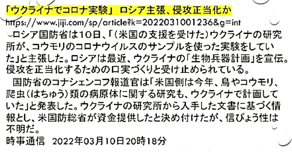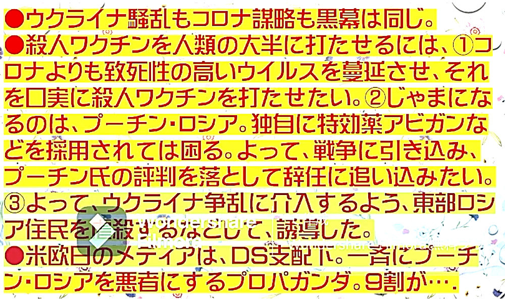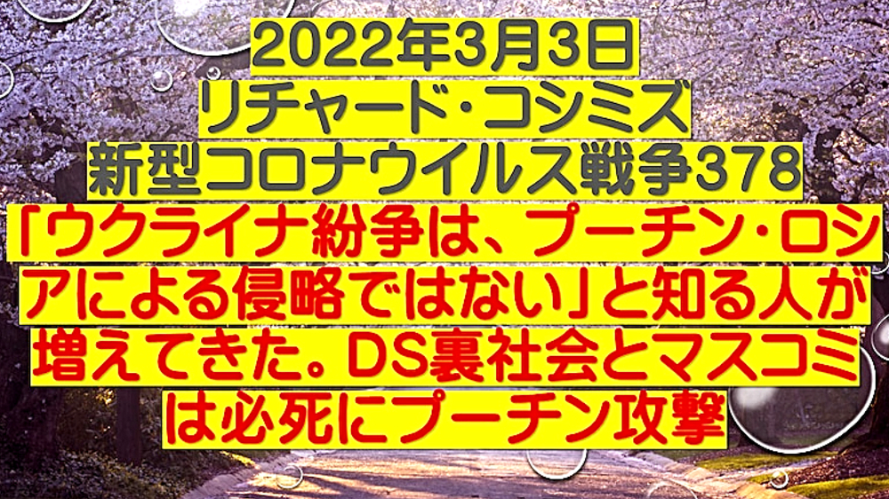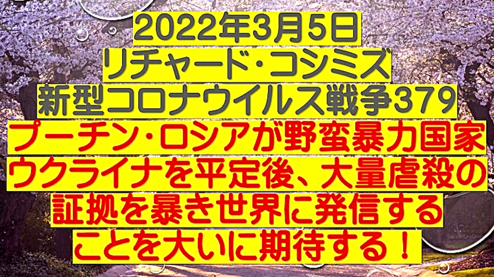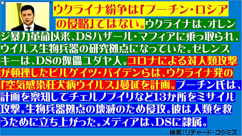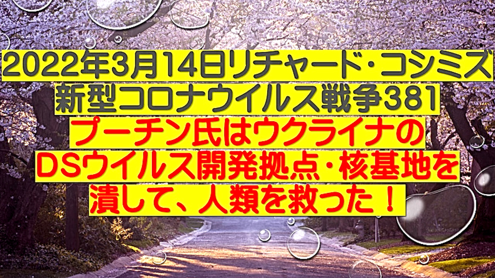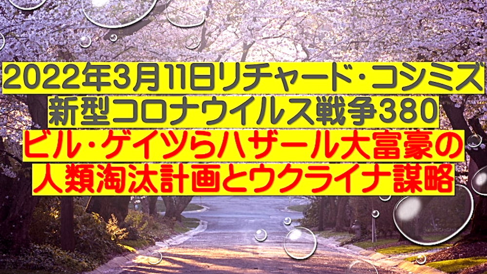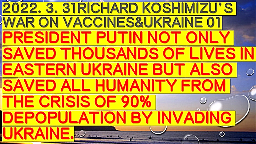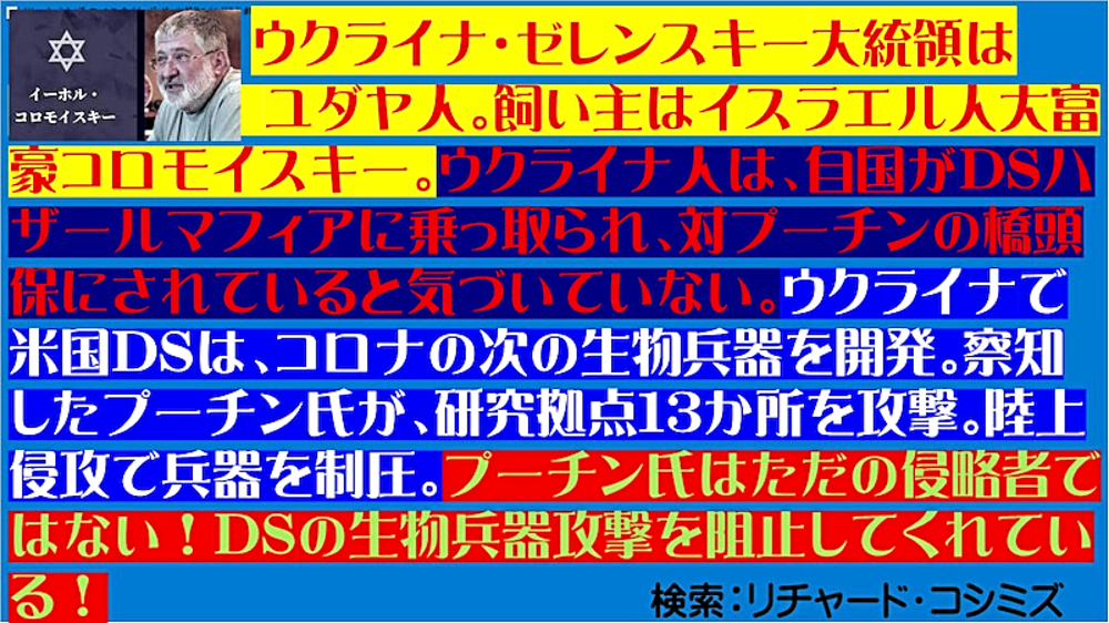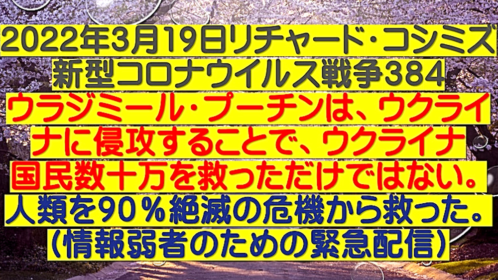 「ウラジミール・プーチン氏は、ウクライナに侵攻することで、ウクライナ国民数十万を救っただけではない。人類を90%絶滅の危機から救った (情報弱者のための緊急配信)」 ◆ウクライナのアザロフ元首相、「プーチンは、ウクライナ東部の数十万人の命を救った」。ウクライナ政府は、2月25日からロシア系住民の皆殺しを計画していたが、ロシアはそれを防ぐために、前日に軍事介入。また、NATOウクライナ基地は、ロシアへの核攻撃も計画していた。 ◆DEEP STATEハザール・マフィアは、9.11でも3.11でも核兵器を使ってきた。OKCビル(オクラホマシティ連邦政府ビル爆破事件)、バリディスコ爆破事件(バリ島爆弾テロ事件)、チェルノブイリ原子力発電所事故でも。よって、DEEP STATEハザールマフィアが支配するウクライナが、核兵器を使ったとしても、何一つ不思議ではない。 ◆「アビガン・イベルメクチン」は、ビル・ゲイツらが次に投入してくる強毒ウイルス(恐らく、空気感染型狂犬病、致死率100%)の感染予防・治療に使える特効薬である。よって、WHO・厚生労働省が必死にブロック。毒ワクチンを全人類に打たせるために。 |