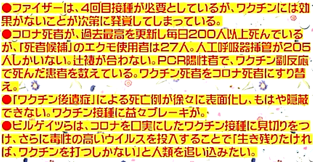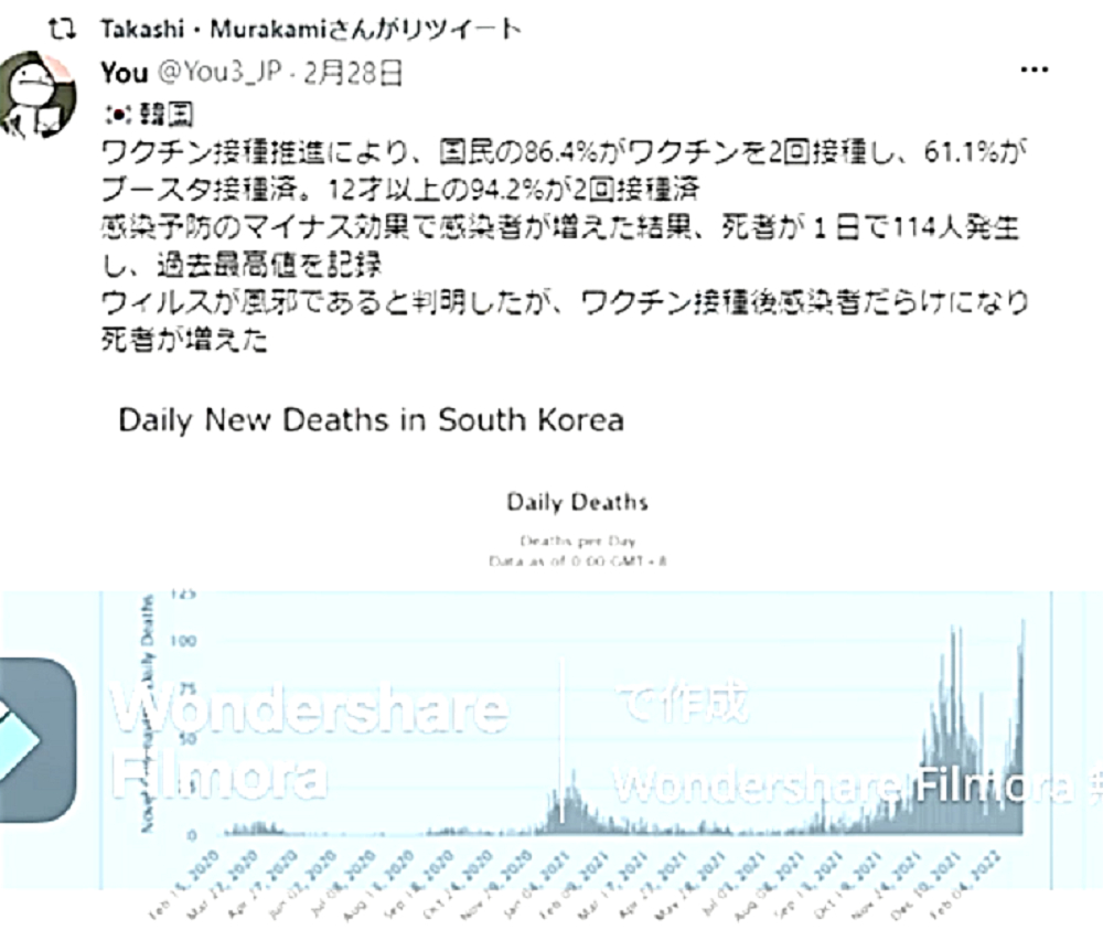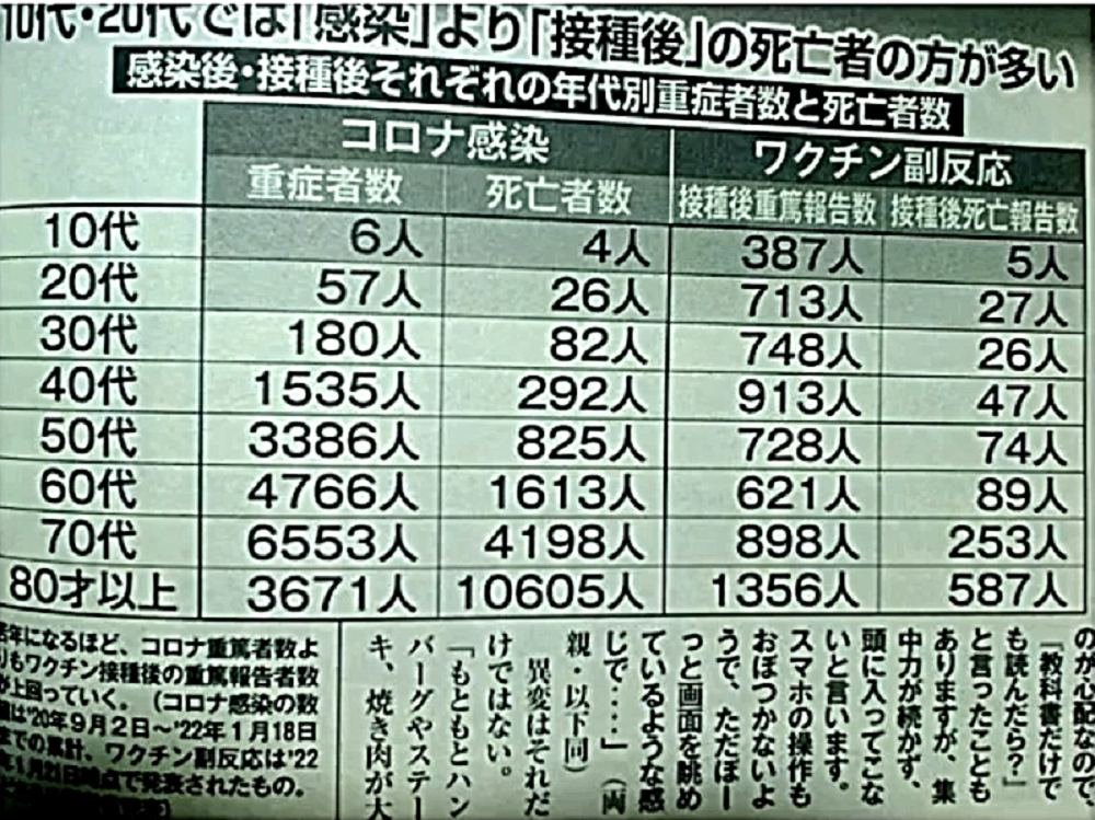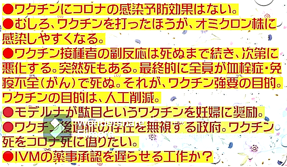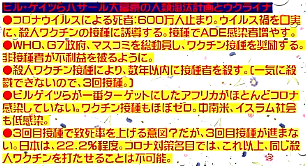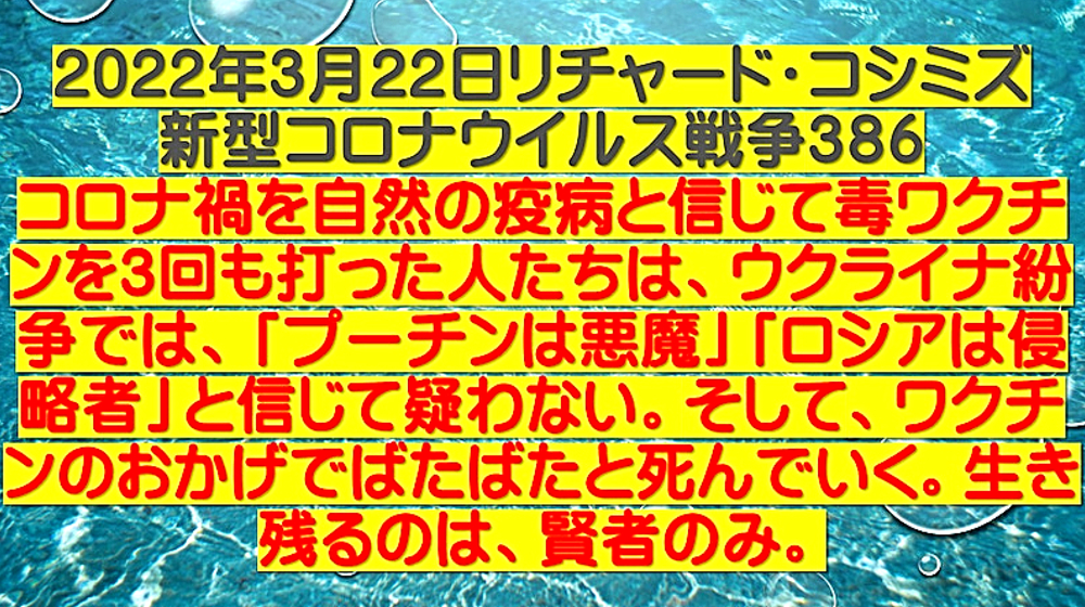 「コロナ禍を自然の疫病と信じて毒ワクチンを3回も打った人たちは、ウクライナ紛争では、『プーチンは悪魔』・『ロシアは侵略者』と信じて疑わない。そして、ワクチンのおかげで、バタバタと死んでいく。生き残るのは、賢者のみ」 ◆ウクライナ市民は、ウクライナ軍が自国民に発砲していることを、皆知っている。 ◆ゼレンスキー大統領は、米軍(NATO軍)を戦争に引きずり込むために、自国民を殺して「ロシア軍がやった」と報道させ、NATOはウクライナの虐殺と分かっていながら声明を出す。ロシアがウクライナへ侵攻した日に、アメリカはソマリアへ、イスラエルはシリアへ空爆。戦争好きのNATOが悪さを始めている。 ◆生まれてからずっと、地下シェルターで育った子どもたち、ロシア・ウクライナ戦争 ◆フランス人ジャーナリストが証言 「ウクライナを爆撃しているのは、ロシア軍ではない。ウクライナ軍である」 ◆チリ共和国は、人口の93%がワクチン接種済みであるが、1~2月、ワクチン接種が比較的進んでいない子供以外の全ての年齢層で、甚大な超過死亡(50%)を発生させている。ワクチン接種が進んだ年齢層でのみ、超過死亡が増加。さらに、この超過死亡は、欧州各国のパンデミックの最悪期に相当する。 ◆ロバート・ウォレス・マローン博士(mRNAワクチンの発明者) 「いかなる状況下であっても、決してこのワクチンを接種してはならない」 ◆リュック・アントワーヌ・モンタニエ博士(ウイルスの研究でノーベル賞受賞) 「ワクチンの大量接種は、とんでもない過ちである。科学的な誤りであると同時に、医学的な誤りでもある。受け入れがたい過ちだ。なぜなら、ワクチン接種が変異株を生み出しているのだから」 ◆ギアート・バンデン・ボッシュ博士 「生来の免疫機能が毀損する。すぐにワクチン接種をやめろ!」 ◆キャリー・バンクス・マリス博士(PCR検査の発明者 ノーベル賞受賞) 「連中は間違った使い方をしている。PCRを感染症に使ってはならない」 ◆マイケル・イードン博士(元ファイザー副社長) 「ワクチン接種を行うと、数年内に死にます。政府が嘘をつくのは、あなた方を殺すためです」 ◆リー・メリット博士(米海軍の生物兵器研究者) 「新型コロナワクチンは、完全に『生物兵器』である」 ◆忽那賢志 大阪大学医学部教授(ワクチン接種による人類大虐殺共犯者) 「4回目のワクチン接種の有効性について、イスラエルから報告が出てきています。残念ながら劇的な効果というものではなく、ワクチン政策は大きな岐路に立たされそうです」 |