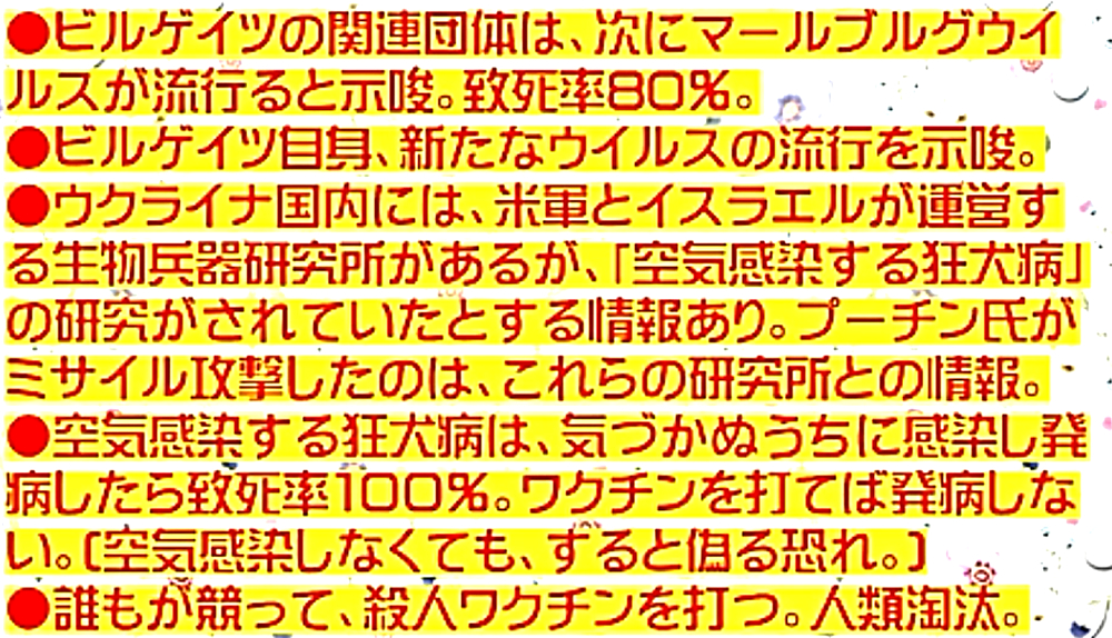 「『ビル・ゲイツらハザール大富豪の人類淘汰計画』と『ウクライナ謀略』」 ◆コロナウイルスによる死者:600万人止まり。ウイルス禍を口実に、殺人ワクチンの接種に誘導する。接種でADE感染者増やす。 ◆WHO、G7政府、マスコミを総動員し、ワクチン接種を奨励する。非接種者が不利益を被るように。 ◆殺人ワクチン接種により、数年以内に接種者を殺す(一気に殺戮できないので、3回接種)。 ◆ビル・ゲイツらが、一番ターゲットにしていたアフリカがほとんどコロナ感染していない。ワクチン接種もほぼゼロ。中南米、イスラム社会も低感染。 ◆ワクチン3回目接種で致死率を上げる意図?だが、3回目接種が進まない。日本は、22.2%程度である。コロナ対策名目では、これ以上、同じ殺人ワクチンを打たせることは不可能である。 ◆ファイザーは、ワクチン4回目接種が必要としているが、「ワクチンには効果がない」ことが次第に発覚してしまっている。 ◆コロナ死者が過去最高を更新し、毎日200人以上死んでいるが、「死者候補」のエクモ使用者は27人。人工呼吸器挿管が205人しかいない。辻褄が合わない。PCR陽性者で、ワクチン副反応で死んだ患者を数えている。ワクチン死者をコロナ死者にすり替えている。 ◆「ワクチン後遺症」による死亡例が徐々に表面化し、もはや隠蔽できない。ワクチン接種に益々ブレーキが。 ◆ビル・ゲイツらは、コロナを口実にしたワクチン接種に見切りをつけ、さらに毒性の高いウイルスを投入することで「生き残りたければ、ワクチンを打つしかない」と人類を追い込みたい。 ◆ビル・ゲイツの関連団体は、次に「マールブルグ・ウイルス」が流行ると示唆。致死率80%。 ◆ビル・ゲイツ自身も、新たなウイルスの流行を示唆。 ◆ウクライナ国内には、米軍とイスラエルが運営する「生物兵器研究所」があるが、「空気感染する狂犬病」の研究がされていたとする情報あり。プーチン氏がミサイル攻撃したのは、これらの研究所との情報。 ◆空気感染する狂犬病は、気付かぬうちに感染し発病したら致死率100%。ワクチンを打てば発病しない(空気感染しなくても、すると偽る恐れ)。 ◆誰もが競って、殺人ワクチンを打つ。人類淘汰。 ◆コロナ特効薬「アビガン」は、「マールブルグ病・狂犬病ウイルス」にも効果があるとの研究成果。 ◆日本政府は安倍晋三政権の時に、「アビガン200万人分」を備蓄しているが、「コロナの次」に蔓延させる強毒ウイルス対策で、DEEP STATE裏社会100万人のための備蓄ではないのか? ◆現在、「アビガン」は、他の内服薬が認可されたのを口実に、臨床現場で使えなくされ、残りは回収されている。その影響で重症化患者が増えている? ◆「イベルメクチン」も、狂犬病に効果がある可能性がある。 ◆「イベルメクチン」は、興和がコロナ対象で第3相試験中だが、試験完了が3月末の筈が6ヶ月伸びている。すんなり認可されることは絶対にない。 ◆「イベルメクチン」の個人輸入を妨害しようとする動きがある。一部で警察が内偵している模様だが、違法性は希薄なので、動きようがない。 ◆DEEP STATE裏社会が、狂犬病・マールブルグ病で攻撃してくると想定される。よって、両薬(アビガン、イベルメクチン)の備蓄で防衛を。 ◆ウクライナのウイルス拠点が潰されたとすれば、安倍晋三の息の掛かった岡山理科大学獣医学部が、新たなウイルス拠点に使われる恐れが。 |