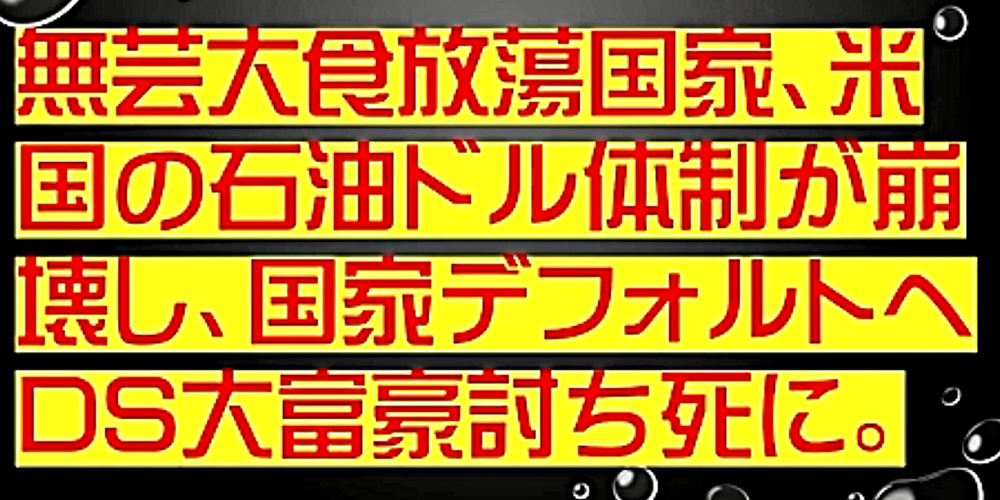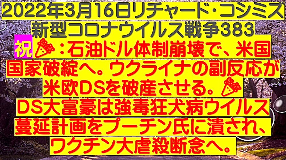 「祝:石油ドル体制崩壊で、米国国家破綻へ。ウクライナの副反応が米欧DEEP STATEを破産させる。DEEP STATE大富豪は強毒狂犬病ウイルス蔓延計画をプーチン氏に潰され、ワクチン大虐殺断念へ」 ◆無芸大食放蕩国家、米国の石油ドル体制が崩壊し、国家デフォルトへ。DEEP STATE大富豪討ち死に。 ◆石油購入にドルが使われるから無価値なドルに価値が付き、国家破綻を免れてきた。 ◆米ドルが崩壊すれば、DEEP STATEハザール大富豪も破綻。世界の支配構造が崩壊し、人類が解放される。DEEP STATE裏社会は生物戦争・核兵器で抵抗。 ◆露西亜,中国,ドナルド・トランプ氏は、ウクライナ危機に乗じて、米欧DEEP STATE勢力を一気に壊滅させようと画策しているのか? ◆ドナルド・トランプ氏は、あえて、不正選挙追及を中断し、米国国家破綻の汚れ役をジョー・バイデン氏に背負わせた後、再登場か? ◆DEEP STATEの破綻を胡麻化し有耶無耶にするには、さらなるウイルス戦争の勃発を仕組むしかない。 ◆ワクチン接種を普及させないと、人類90%淘汰作戦を実行できない。だが、ワクチン禍を隠し切れない。 |