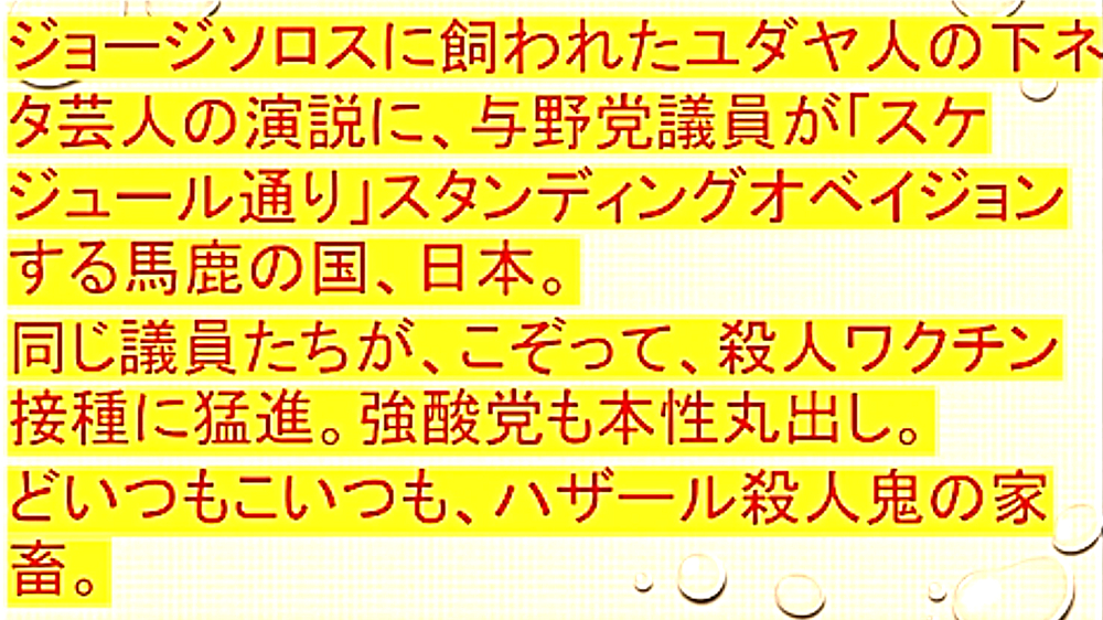 「JEWクライナ国王、ジョージ・ソロス・ユダヤ人が、G7の飼い犬を総動員して、必死のプーチン攻撃。結末は、ユダヤ世界帝国崩壊」 ◆ジョージ・ソロスに飼われたユダヤ人の下ネタ芸人の演説に、与野党議員が「スケジュール通り」スタンディングオベイジョンする馬鹿の国、日本。同じ議員たちが、こぞって、殺人ワクチン接種に猛進。強酸党も本性丸出し。どいつもこいつも、ハザール殺人鬼の家畜。 ◆国会連帯、与野党拍手 ゼレンスキー氏演説 支持一色 ちらつく危うさ ◆国会の満場一致の拍手見たでしょ?「ゼレンスキーのお涙頂戴の演説に与野党が感動して、ウクライナを支援する」というデキレースなわけだよ。こうして日本は、アメリカのネオコンが仕掛けた戦争に加担させられる。イラクの侵略戦争に協力した黒歴史を全く反省していないから、同じことが繰り返される。 ◆ネオナチを使ってドンバス地域のロシア系住民を虐殺した件、国連の条約に違反して生物兵器を開発していた件について、ゼレンスキーは一言も言及しなかった。自分が戦争のきっかけを作った責任について、ゼレンスキーは一言も反省の弁を述べなかった。こいつがいかに信用できない野郎かということだよ。 |