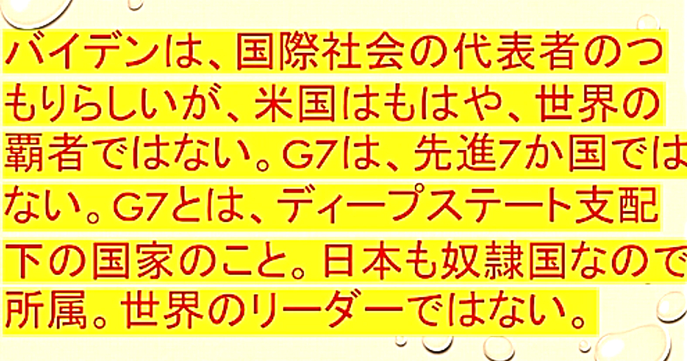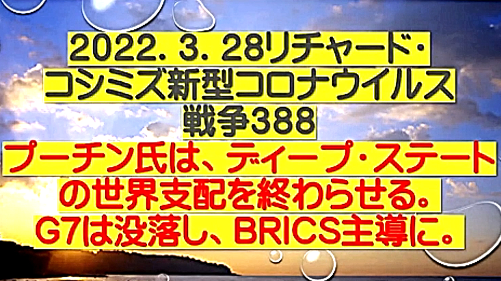「ウラジーミル・プーチン氏は、ディープ・ステートの世界支配を終わらせる。G7は没落し、BRICS(Brazil,Russia,India,China,South Africa)主導に」 ◆対露制裁は、米 + EU + 金魚の糞だけ。 ◆ジョー・バイデンは、国際社会の代表者のつもりらしいが、米国はもはや、世界の覇者ではない。よって、G7は、先進7か国ではない。G7とは、ディープステート支配下の国家のことである。日本も奴隷国家なので、G7に所属している。世界のリーダーではない。 ◆ブルガリアの将軍 シビコフ氏 「ウクライナのゼレンスキーは、まもなく国の降伏を発表する」とブルガリア国営放送で語った。 「この紛争に勝利するのは、間違いなく特別軍事作戦に参加しているロシア連邦とその軍隊でしょう。敗者は、ウクライナ政権とその軍隊である」と述べた。 ◆「対ロシア制裁を実施した国」と「コロナによる入院患者の多い国(2022年3月15日)」が、見事に一致している。 ◆対露制裁に実効力なし。逆に、制裁する側が困る。ガソリン高騰でバイデン支持率↓(共和党支持者は反駁)。ウクライナ危機を契機に、BRICS主導の世界に。 |