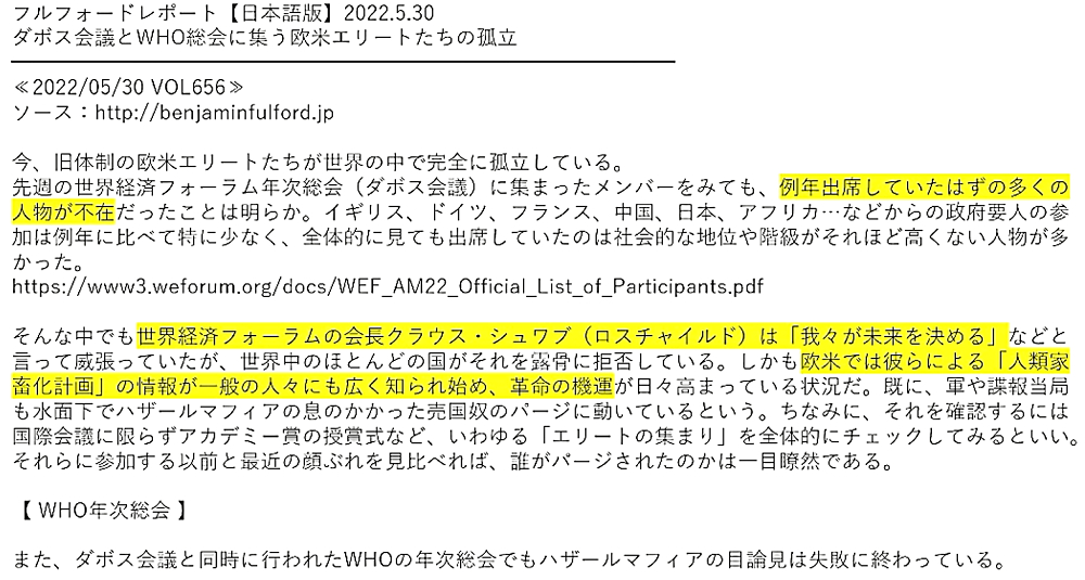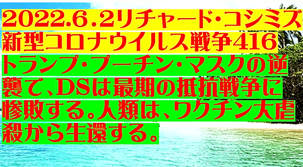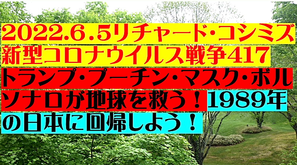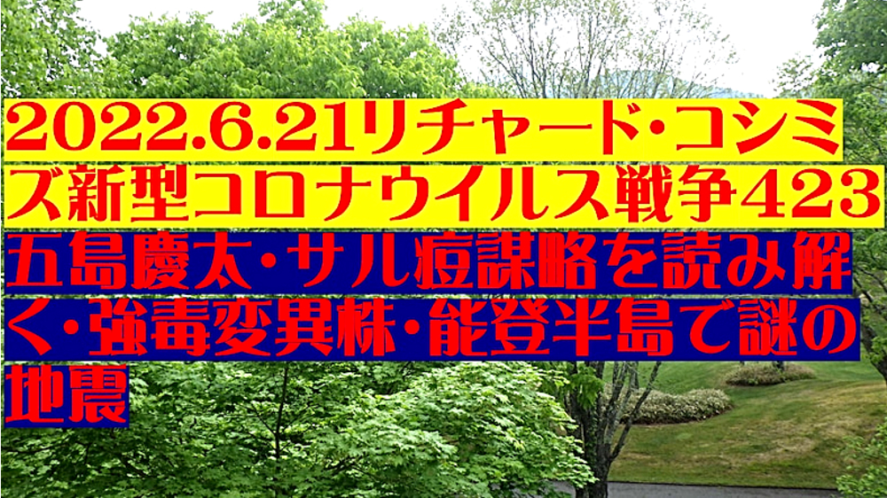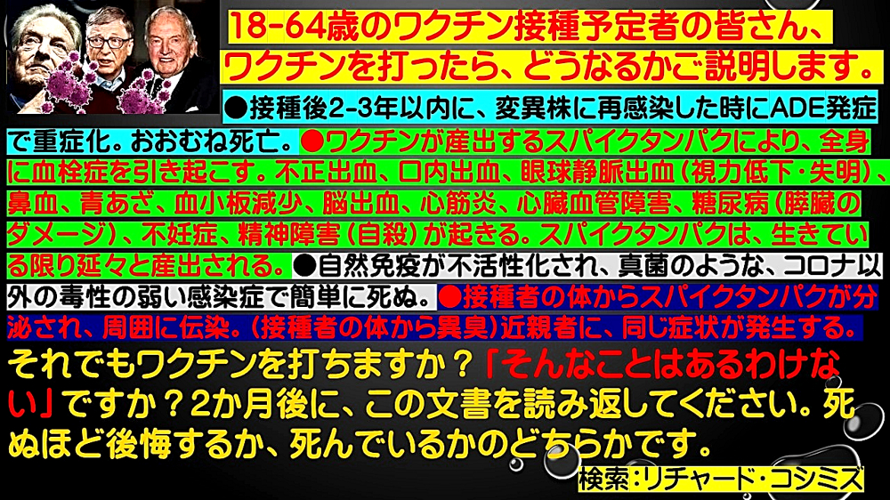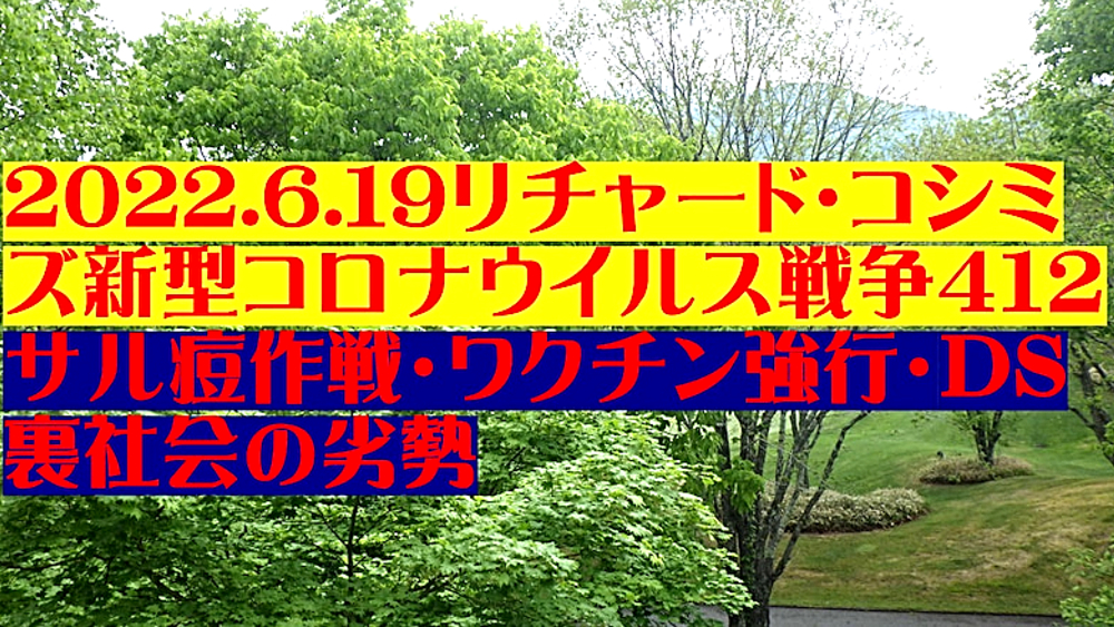 「『ドナルド・トランプ、ウラジーミル・プーチン、イーロン・マスク、ジャイル・ボルソナロ』が地球を救う!『1989年の日本』に回帰しよう!」 ◆ダボス会議、踊らず。WHO総会に抵抗勢力。 ◆ワクチンの目的は、感染予防ではない。ワクチン接種者を殺すことである。 ◆ワクチン接種により、感染を広げている。 ◆ワクチン接種者数を水増ししている。米国・英国も同様。世界規模で詐欺。 ◆サル痘の原因がコロナワクチン接種なら、今後、全世界で蔓延する。サル痘ワクチンを追接種すると重症化。それが狙いか? ◆日本の政治:野党が自滅。改憲へ。 ◆国家が、国民に何事も「強制」する動きを定常化。歯科検診・犬猫チップ・NHK受信料・株投資・マイナンバー保険証。 ◆人口動態から見る、今後の日本人の生き死に。 |