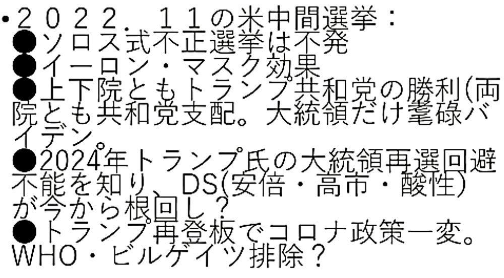 「『ドナルド・トランプ、ウラジーミル・プーチン、イーロン・マスク』の逆襲で、『DEEP STATE』は、『最期の抵抗戦争に惨敗』する。『人類は、ワクチン大虐殺から生還する』」 ◆2022年11月の米国中間選挙 ◆「ジョージ・ソロス式不正選挙」は不発 ◆イーロン・マスク効果 ◆上院・下院とも、ドナルド・トランプ共和党の勝利(両院とも、共和党支配。大統領だけ耄碌ジョー・バイデン)。 ◆2024年、ドナルド・トランプ氏の大統領再選回避不能を知り、DEEP STATE(安倍晋三・高市早苗・参政党)が、今から根回し? ◆ドナルド・トランプ氏再登板で、コロナ政策一変。WHO、ビル・ゲイツ排除? |