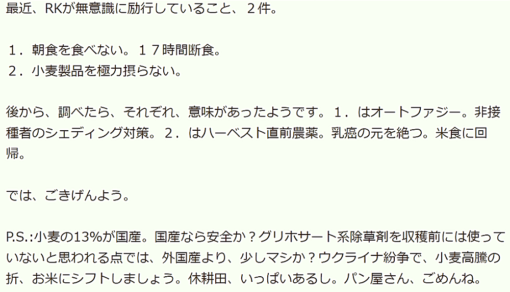 「『パン食から米食へ』。『1日3食から2食へ』。これで、『コロナ、ワクチン・シェディング&ワクチン後遺症』を乗り切ろう!」 |