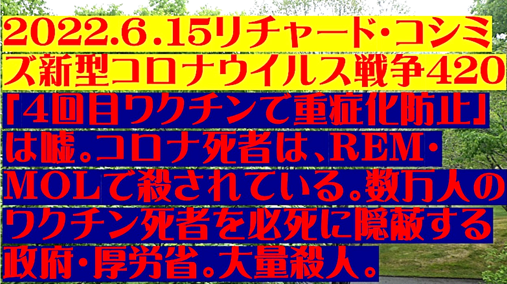「『4回目ワクチン接種で重症化防止』は嘘。コロナ死者は、『REM(レムデシビル)・MOL(モルヌピラビル)』で殺されている。『数万人のワクチン死者』を必死に『隠蔽』する『日本政府・厚生労働省』。『大量殺人』」 |