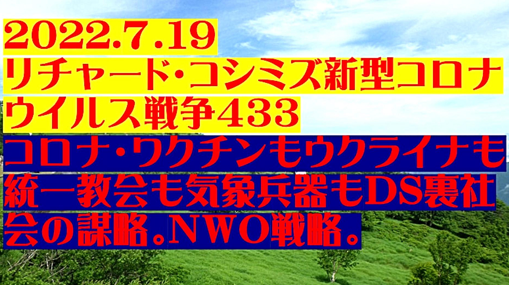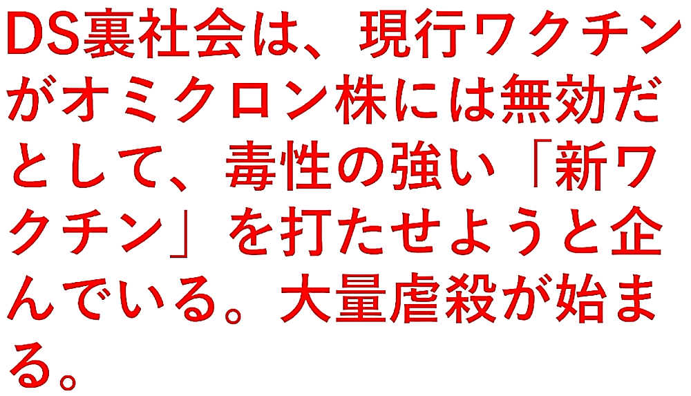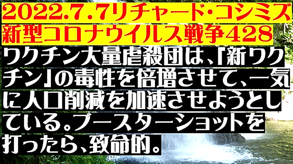 「『ワクチン大量虐殺団』は、『新ワクチンの毒性』を倍増させて、『一気に、人口削減を加速させよう』としている。『ブースターショット』を打ったら、致命的」 ◐DEEP STATE裏社会は、「現行ワクチンがオミクロン株には無効」だとして、毒性の強い「新ワクチン」を打たせようと企んでいる。大量虐殺が始まる。 ◐武漢株ワクチンの接種で、オミクロン変異株に感染しやすくなり、感染者が増えている。よって、「ワクチン接種の強化」は逆効果。 ◐ワクチンを打ってしまっていても、イベルメクチン服用で、悪影響は排除できるようである。 ◐「ワクチン以外のコロナ薬」は、徹底して排除される。 ◐ワクチン接種で、出生率が激減する。ビル・ゲイツの人口削減手口。 ◐強毒ロットの接種で、大量虐殺の事前実験。 ◐対露制裁のおかげで、DEEP STATE大富豪の支配は終焉する。 ◐参院選は、チンピラ選挙。「不正選挙構造」に変化はあるのか? ◐国民の8割が毒ワクチンを打つ情弱国家では、「勘違いに基づく投票」しか行われない。よって、自民党・公明党が勝利する。 ◐コロナ・ウクライナから「世界の真相」が知られて、人類が覚醒した後、選挙は正常化される。 ◐ドナルド・トランプ氏が、予想外の勝利を得たことが日本でも起きると予測(中間選挙)。 ◐今のうちから、真っ当な投票行動を習慣化しておきたい(不在者投票)。 |