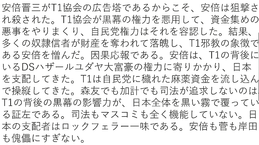 ◐安倍晋三が、T1協会の広告塔であるからこそ、安倍晋三は狙撃され殺された。 ◐T1協会が黒幕の権力を悪用して、資金集めの悪事をやりまくり、自民党権力はそれを容認した。結果、多くの奴隷信者が財産を奪われて落魄し、T1邪教の象徴である安倍晋三を憎んだ。因果応報である。 ◐安倍晋三は、T1の背後にいる「DEEP STATE ハザールユダヤ大富豪」の権力に寄りかかり、日本を支配してきた。 ◐T1は、自民党に穢れた麻薬資金を流し込んで、操縦してきた。 ◐森友問題でも加計問題でも司法が追求しないのは、T1の背後の黒幕の影響力が、日本全体を黒い霧で覆っている証左である。司法もマスコミも全く機能していない。 ◐日本の支配者は、「ロックフェラー一味」である。安倍晋三も菅義偉も岸田文雄も傀儡にすぎない。 |