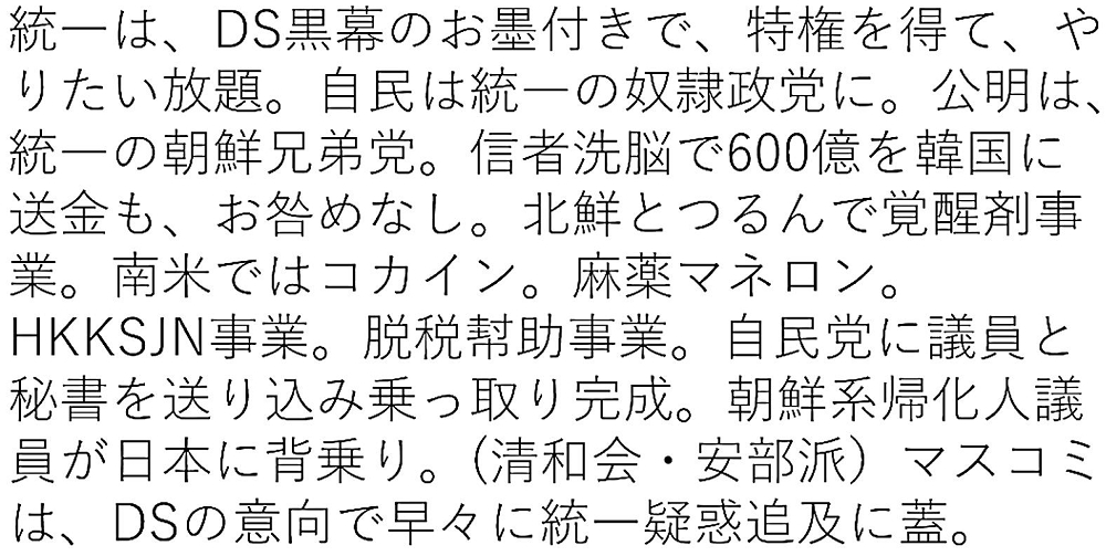「『コロナ・ワクチン』も『ウクライナ』も『統一教会』も『気象兵器』も、『DEEP STATE裏社会の謀略』。『New World Order 戦略』」 ◐統一教会が解れば、自民党に投票する馬鹿は、一人もいなくなる。 ◐統一教会は、DEEP STATE黒幕のお墨付きで、特権を得て、やりたい放題。自民党は、統一教会の奴隷政党に。公明党は、統一教会の朝鮮兄弟党。信者洗脳で、600億を韓国に送金も、お咎めなし。北朝鮮とつるんで、覚醒剤事業。南米ではコカイン。麻薬マネロン。HKKSJN事業。脱税幇助事業。自民党に、議員と秘書を送り込み乗っ取り完成。朝鮮系帰化人議員が、日本に背乗り(清和会・安部派)。マスコミは、DEEP STATEの意向で、早々に統一疑惑追及に蓋。 ◐日本は、国会もメディアも警察も司法も税務署も、統一CIAカルトの支配下。どんな犯罪も隠蔽できる。その漆黒の闇を表に出したのは、安倍晋三さん。死んでくれてありがとう。 ◐統一教会は、上部団体のCIAと同じく、麻薬密輸組織である。統一教会は、CIA極東支部。 ◐統一教会の背後の「CIA・ロックフェラーの対日間接支配構造」。 |