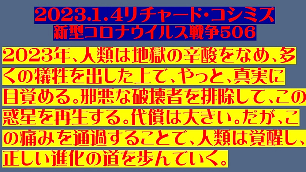 「2023年、『人類』は『地獄』の『辛酸』をなめ、多くの『犠牲』を出した上で、やっと、『真実』に『目覚める』。 『邪悪な破壊者』を『排除』して、この『惑星』を『再生』する。『代償は大きい』。 だが、この『痛み』を『通過』することで、『人類』は『覚醒』し、 『正しい進化の道』を歩んでいく」 |