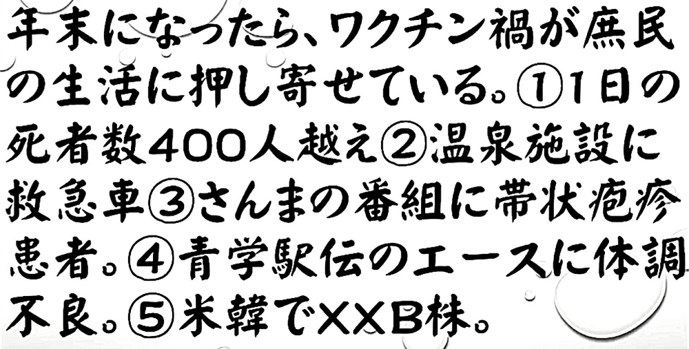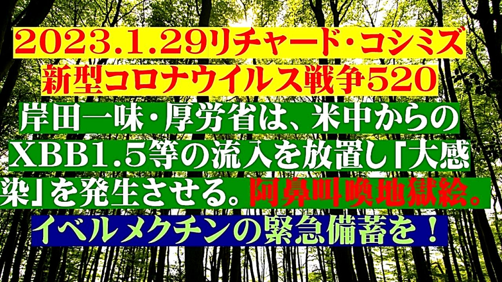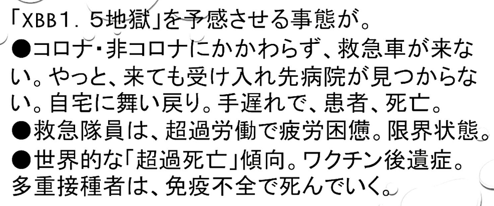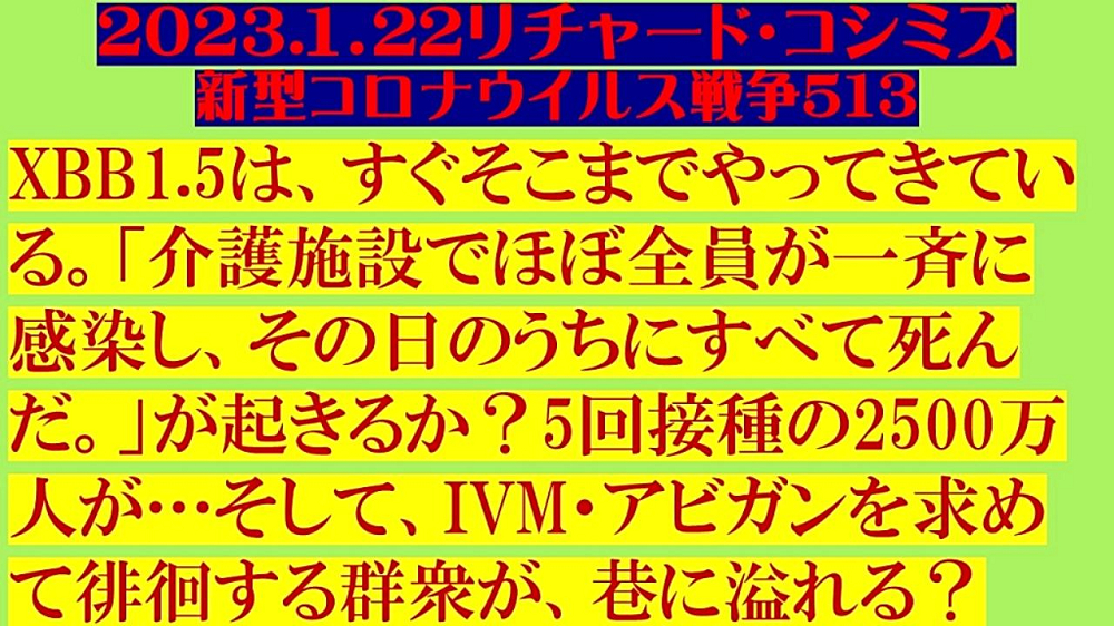 「『XBB1.5』は、『すぐそこまでやってきている』。『介護施設』で『ほぼ全員』が一斉に『感染』し、その日のうちに『すべて死んだ』が起きるか? 『ワクチン5回接種』の『2500万人』が…そして、『イベルメクチン・アビガン』を求めて『徘徊』する『群衆』が、『巷に溢れる?』」 |