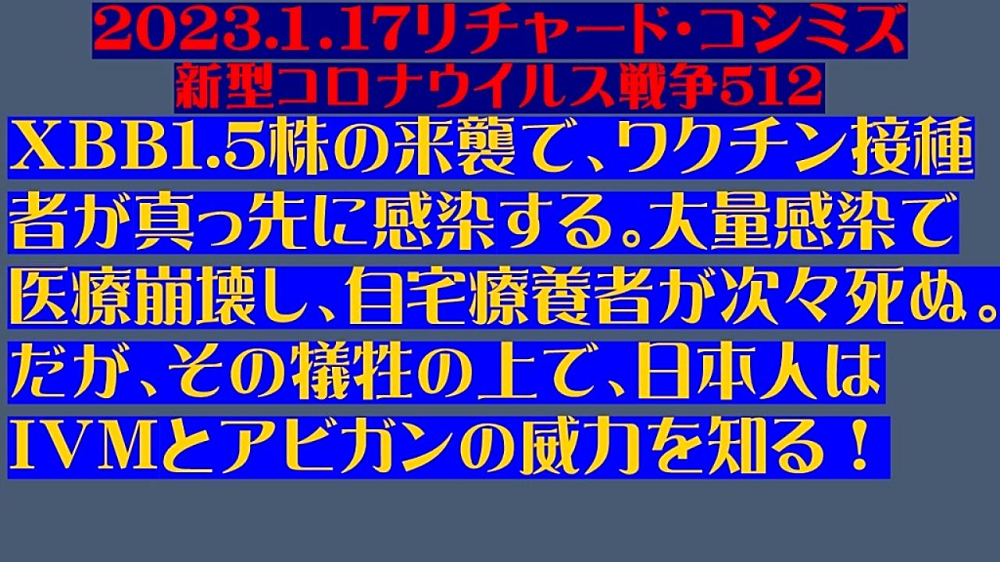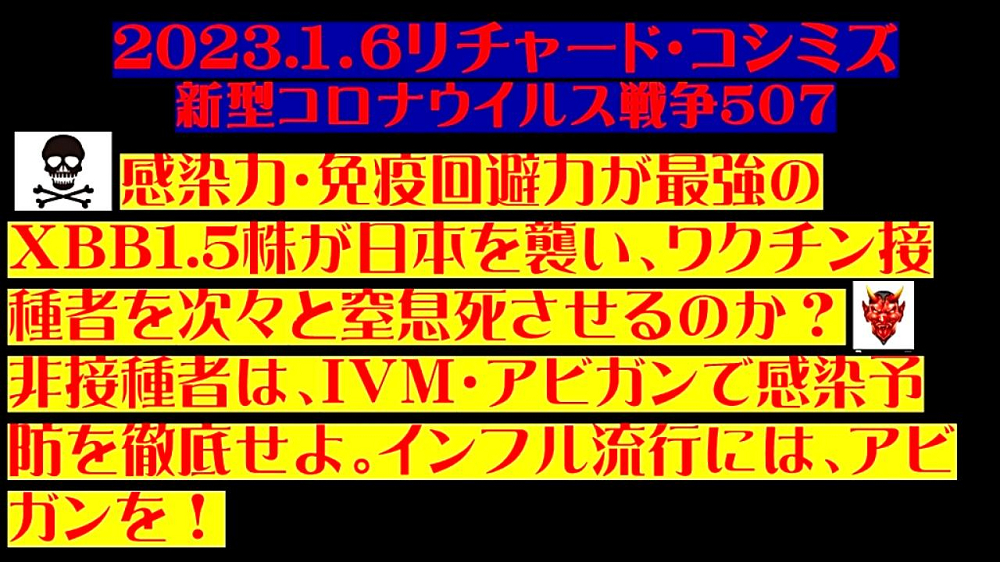 「『感染力・免疫回避力』が『最強』の『XBB1.5株』が『日本』を襲い、『ワクチン接種者』を次々と『窒息死』させるのか? 『ワクチン非接種者』は、『イベルメクチン・アビガン』で、『感染予防』を『徹底』せよ。 『インフルエンザ流行』には、『アビガン』を!」 |