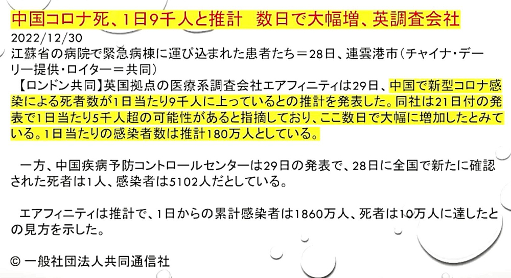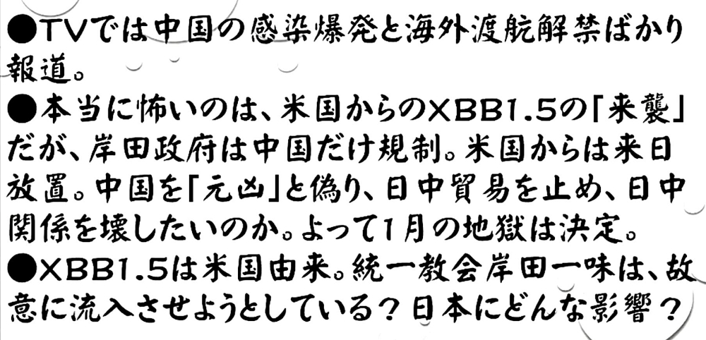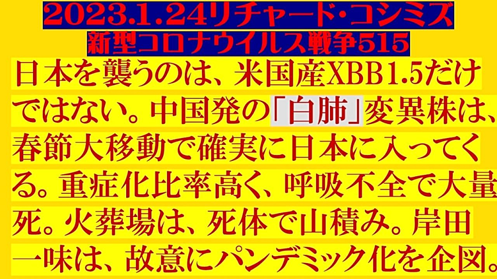「『日本を襲う』のは、『米国産XBB1.5』だけではない。『中国発』の『白肺』変異株は、『春節大移動』で確実に『日本に入ってくる』。 『重症化比率』高く、『呼吸不全』で『大量死』。『火葬場』は、『死体で山積み』。『岸田文雄一味』は、故意に『パンデミック化』を『企図』」 |