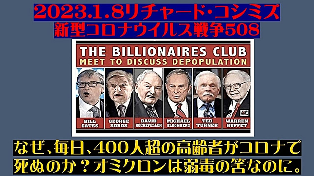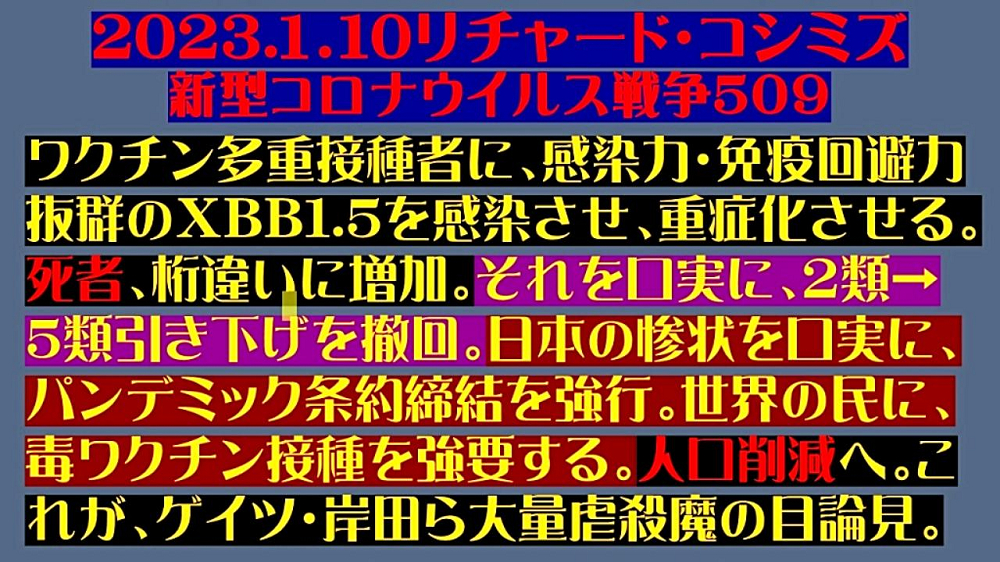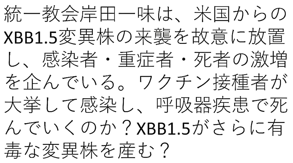 「『ワクチン多重接種者』に、『感染力・免疫回避力』抜群の『XBB1.5』を感染させ、『重症化』させる。『死者』、『桁違い』に『増加』。 それを『口実』に、『2類 ⇒ 5類』引き下げを『撤回』。『日本の惨状』を『口実』に、『パンデミック条約』締結を『強行』。 『世界の民』に、『毒ワクチン接種』を『強要』する。『人口削減』へ。これが、『ビル・ゲイツ , 岸田文雄』ら『大量虐殺魔』の『目論見』」 |