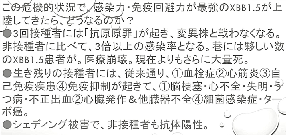 「『XBB1.5株』の『来襲』で、『ワクチン接種者』が、真っ先に『感染』する。『大量感染』で『医療崩壊』し、『自宅療養者』が、次々『死ぬ』。 だが、その『犠牲』の上で、『日本人』は、『イベルメクチン』と『アビガン』の『威力を知る!』」 |