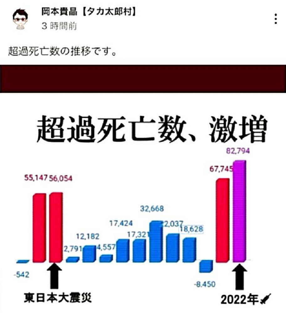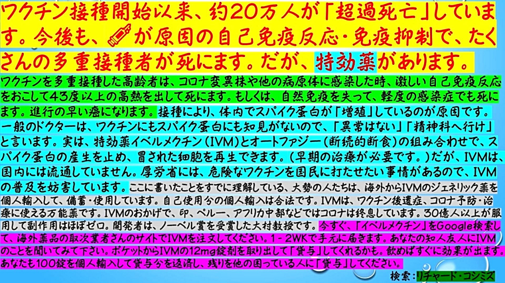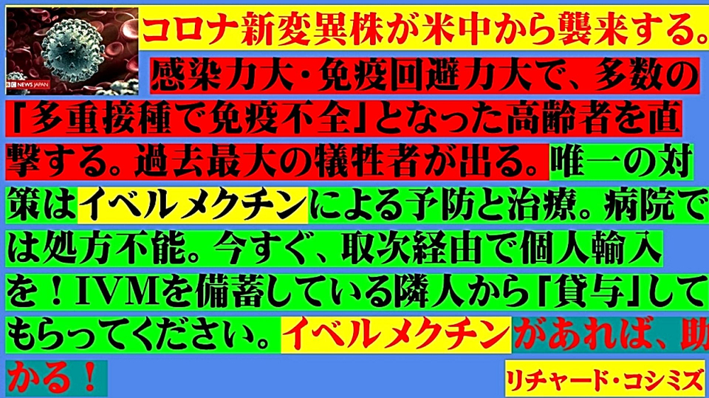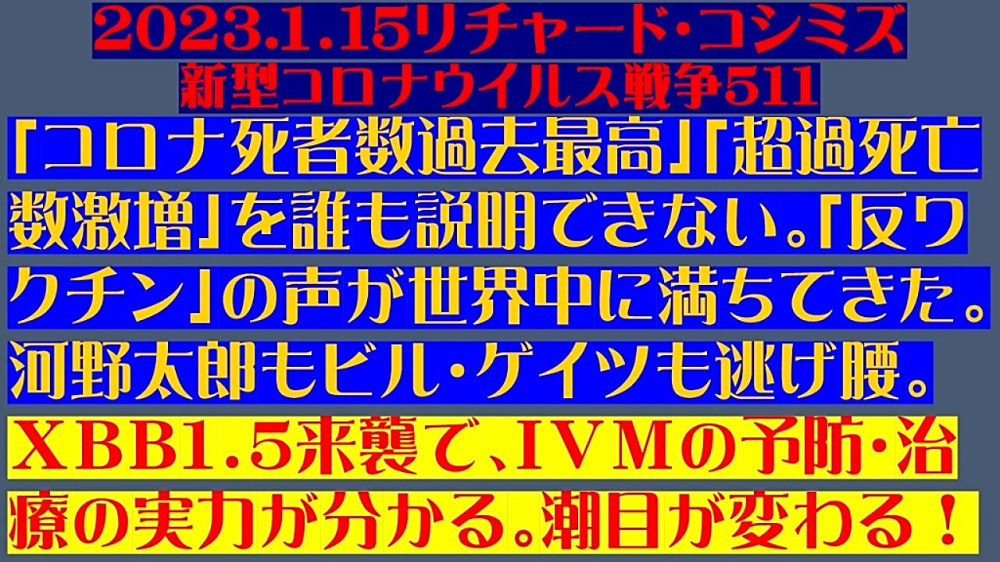 「『コロナ死者数過去最高』・『超過死亡数激増』を、誰も説明できない。 『反ワクチン』の声が、『世界中』に満ちてきた。『河野太郎もビル・ゲイツ』も『逃げ腰』。 『XBB1.5』来襲で、『イベルメクチン』の『予防・治療』の『実力』が分かる。『潮目が変わる!』」 |