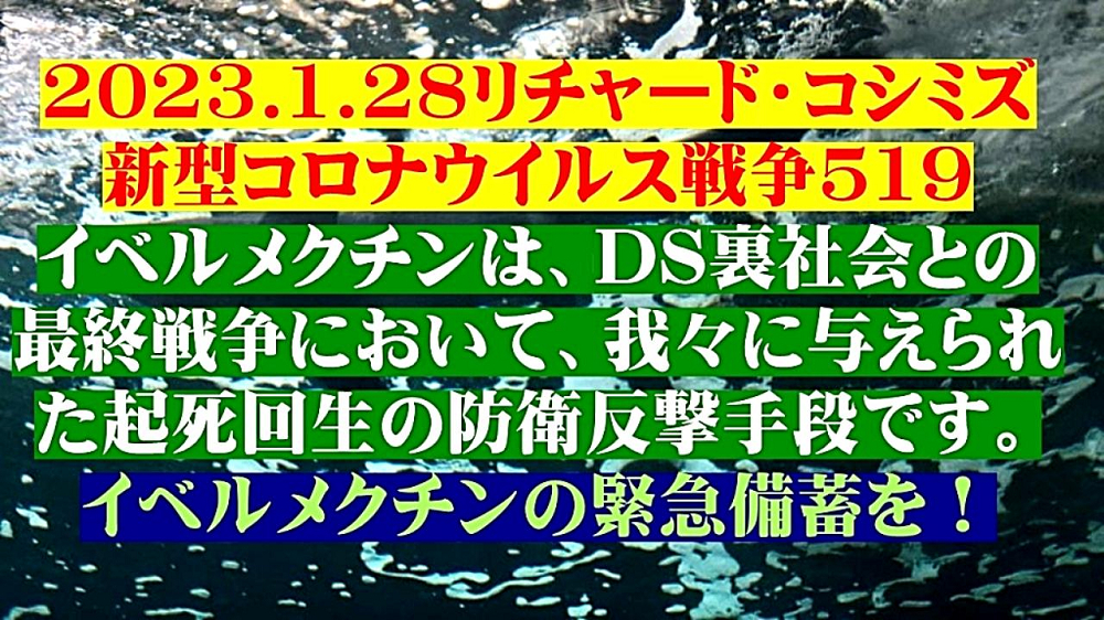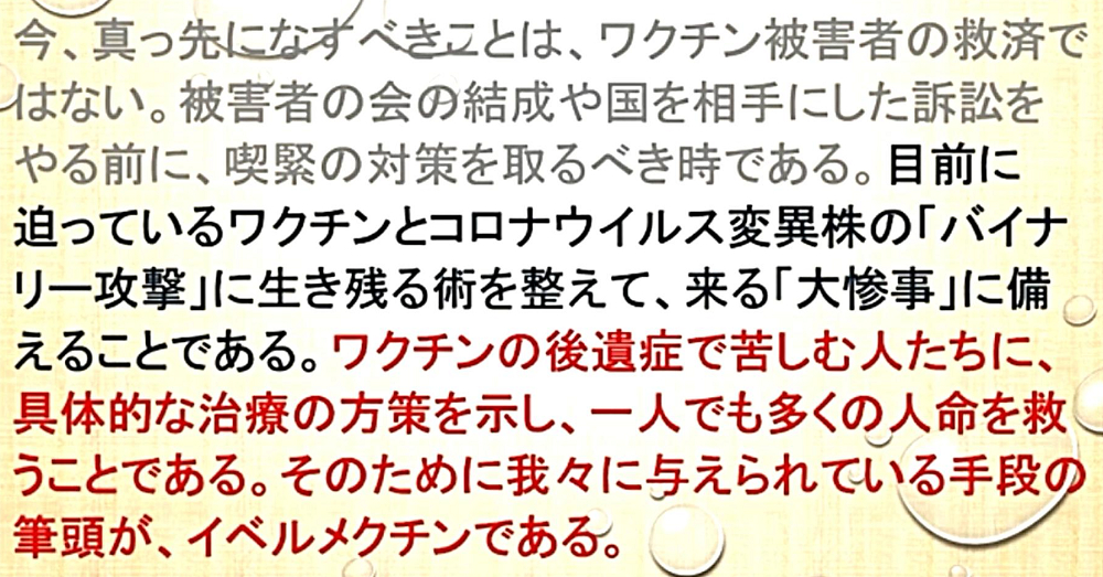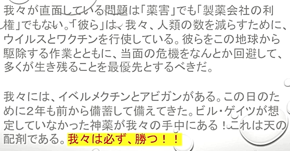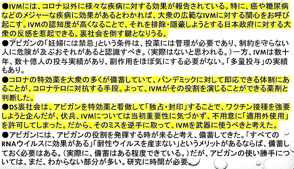 「『イベルメクチン』は、『DEEP STATE裏社会』との『最終戦争』において、我々に与えられた『起死回生』の『防衛反撃手段』です。『イベルメクチン』の『緊急備蓄』を!」 |