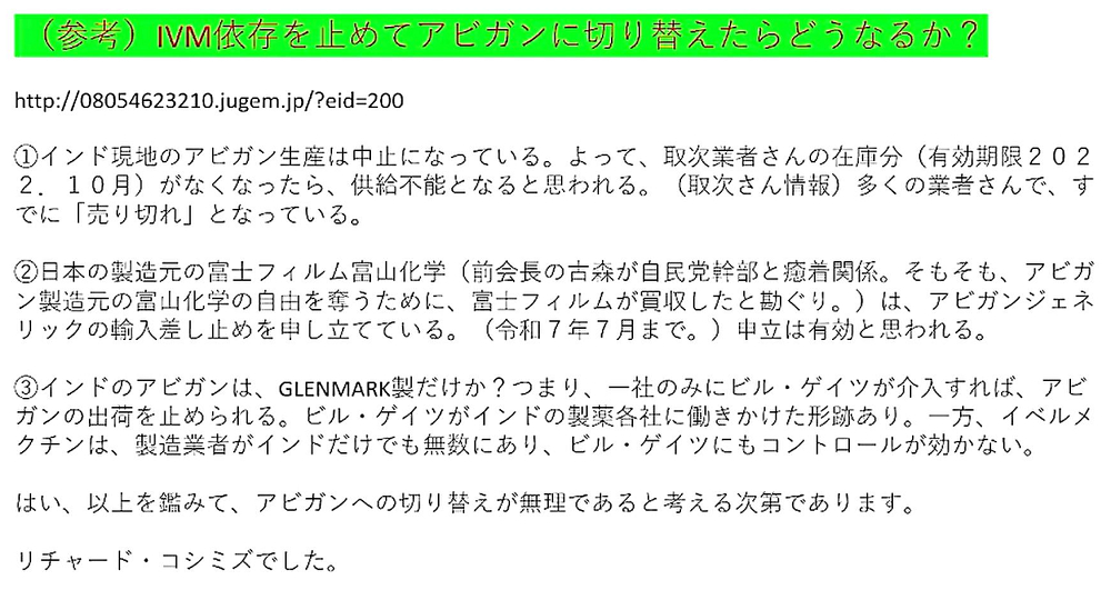 「なぜ、『イベルメクチン』を『優先』して『推奨』してきたのか?『アビガン(ファビピラビル)』は、必要なのか?」 |