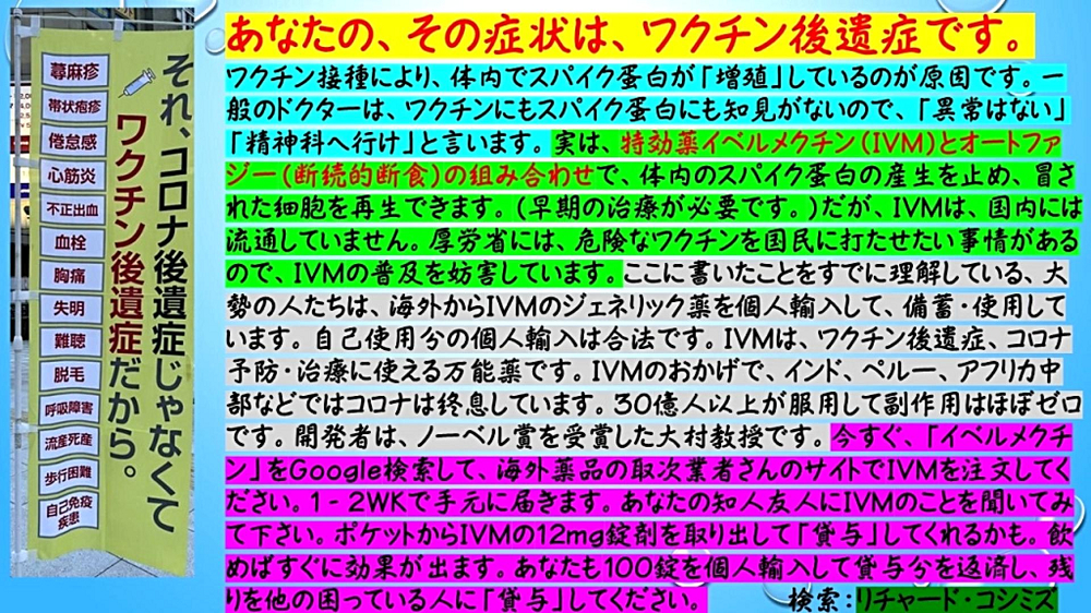 「『日本中』に『イベルメクチン』を『充満』させ、『強毒変異株』も『ワクチン後遺症』も『撃退』し、我々が、『コロナ』を『根絶』する!『イベルメクチン』の『緊急備蓄』を!」 |