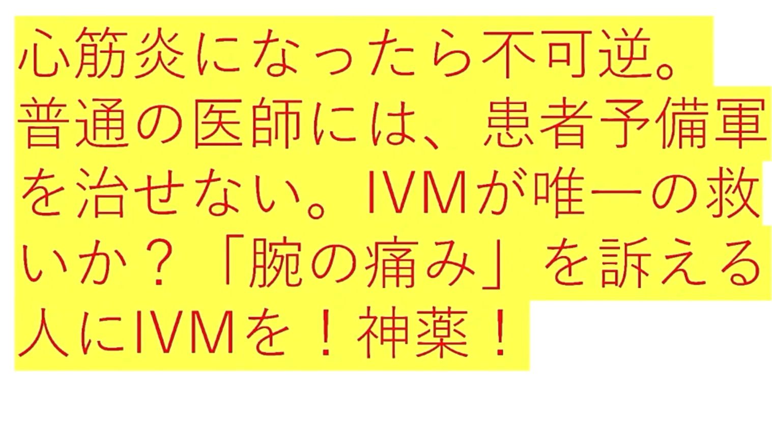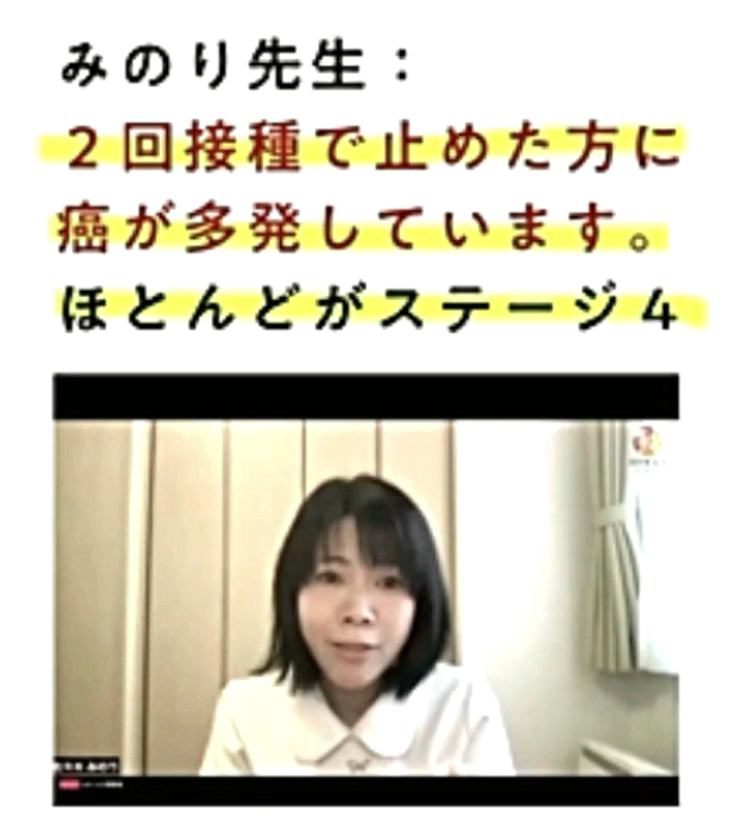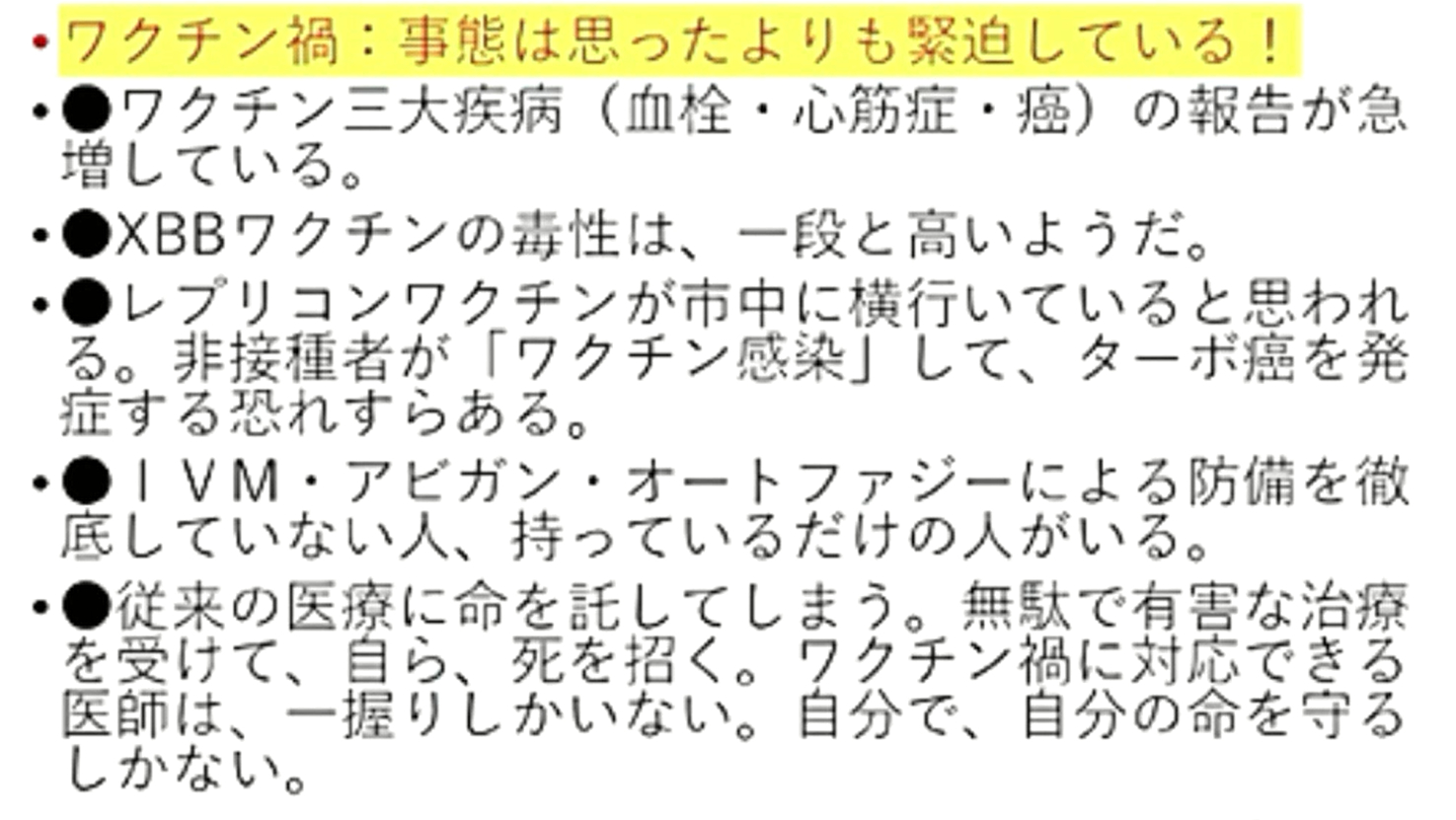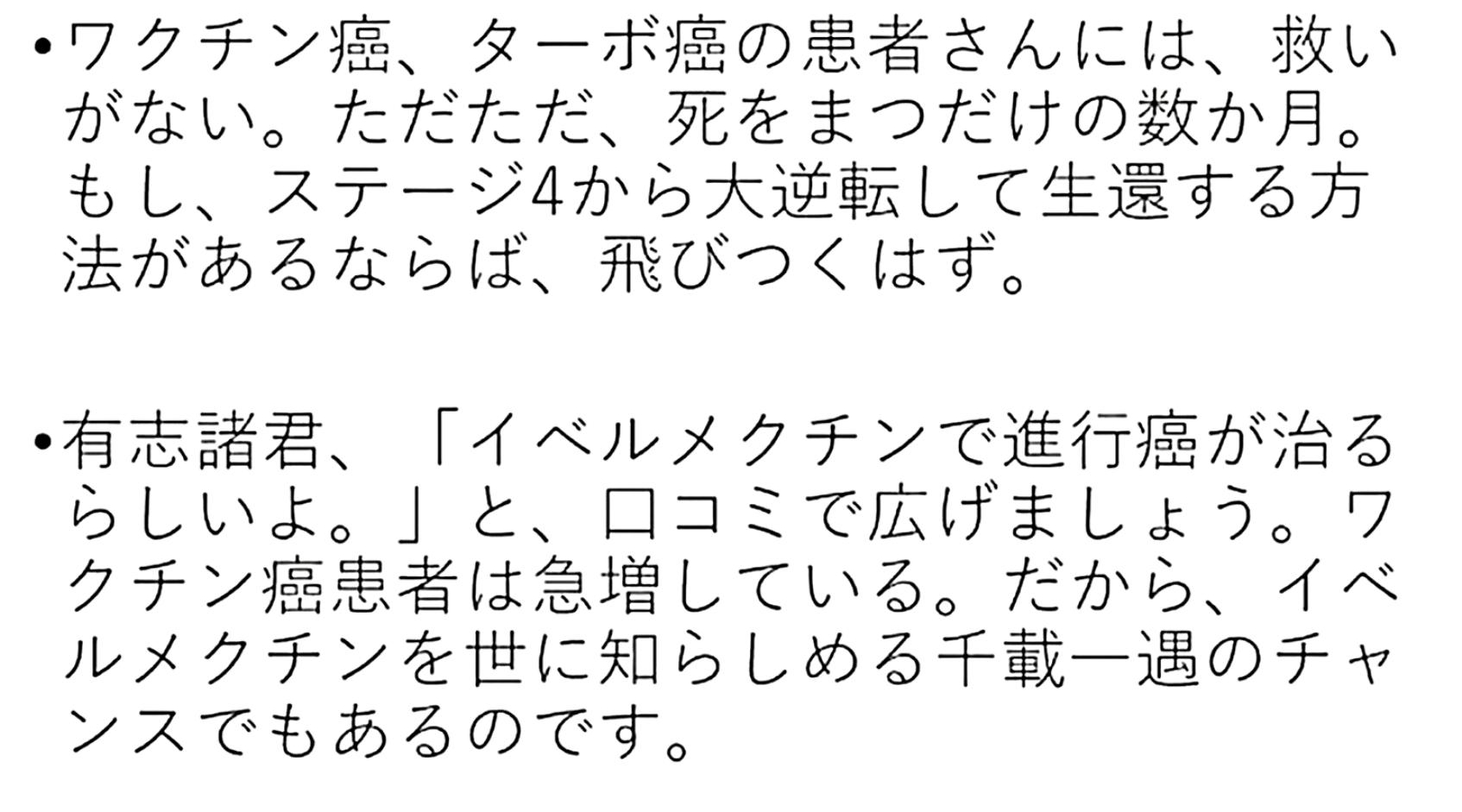 「いきなり『ステージ4の癌』になった?それは『ワクチン癌』です。進行が極めて速い『ターボ癌』です。『余命は数か月』。だが、『イベルメクチン投与』で、次々と『生還』しています。『膵臓癌・肝臓癌』の方、生き残りたかったら、『この動画』を見て下さい。『イベルメクチン治療費』は、『1万円』もあれば『充分』です」 |