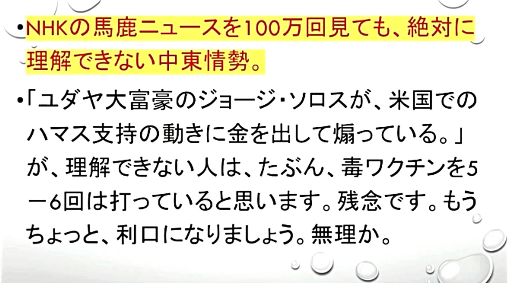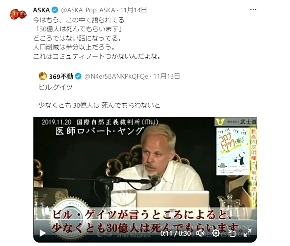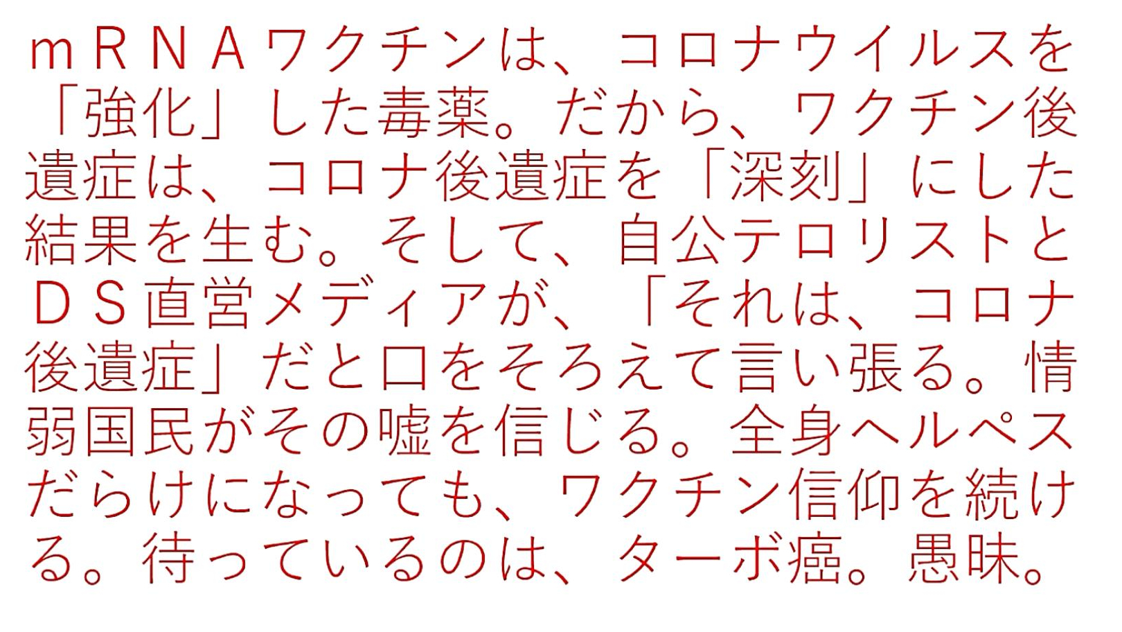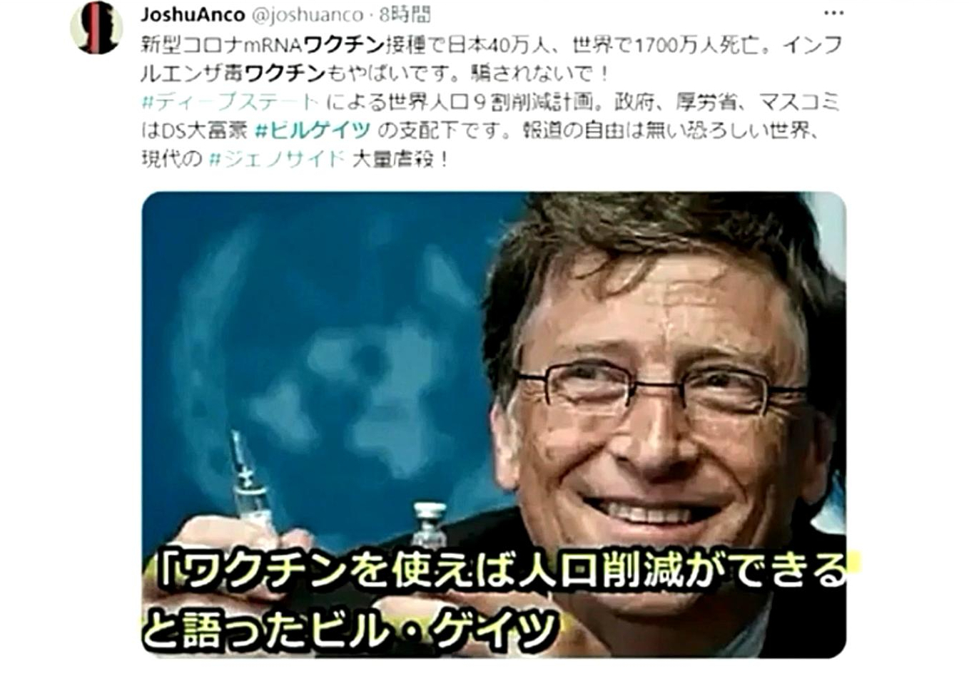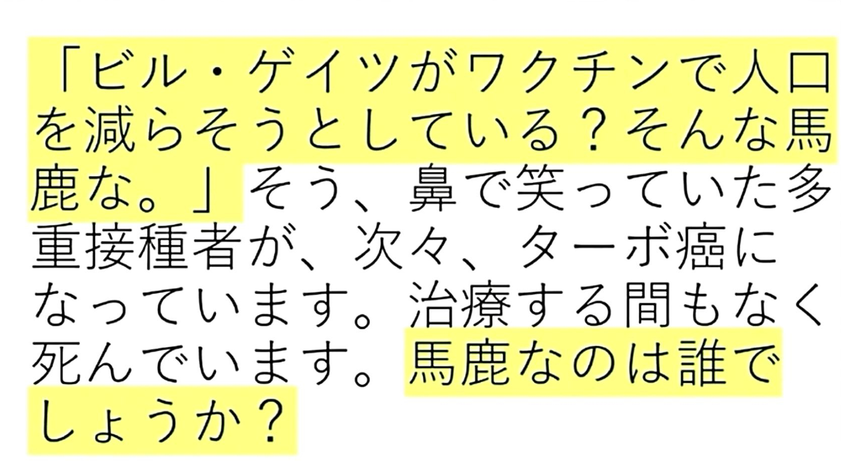 「『X』で、『ビル・ゲイツ&ワクチン』を検索してみて下さい。『毒ワクチンで人類を減らそうとしている』のが分かります。そして、『ゲイツ』たちが必死に『流通を妨害している』のが、『イベルメクチン』と『アビガン』です。つまり、それらの『特効薬』が『ワクチン被害者を救います』」 |