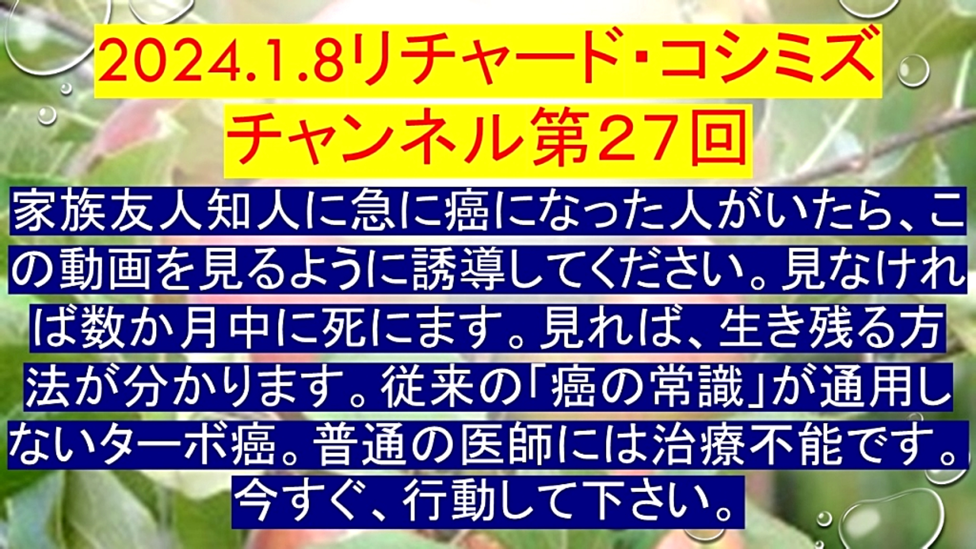 「『家族・友人・知人』に、急に『癌』になった人がいたら、『この動画を見る』ように『誘導』してください。見なければ、『数か月中に死にます』。見れば、『生き残る方法』が分かります。従来の『癌の常識』が通用しない『ターボ癌』。『普通の医師』には『治療不能』です。『今すぐ、行動して下さい』」 |