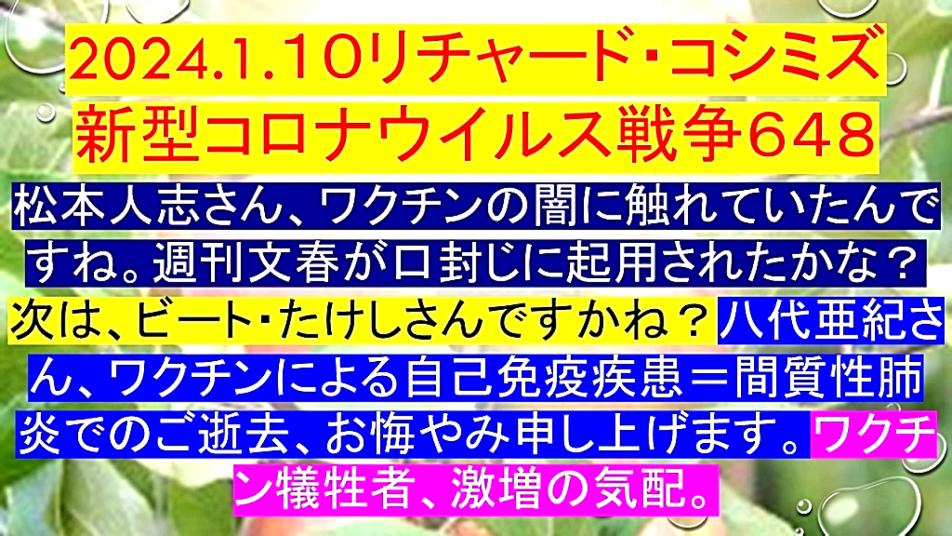 「『松本人志』さん、『ワクチンの闇』に触れていたんですね。『週刊文春』が『口封じ』に起用されたかな? 次は、『ビート・たけし』さんですかね? 『八代亜紀』さん、『ワクチン』による『自己免疫疾患=間質性肺炎』での『ご逝去』、お悔やみ申し上げます。『ワクチン犠牲者、激増の気配』」 |
