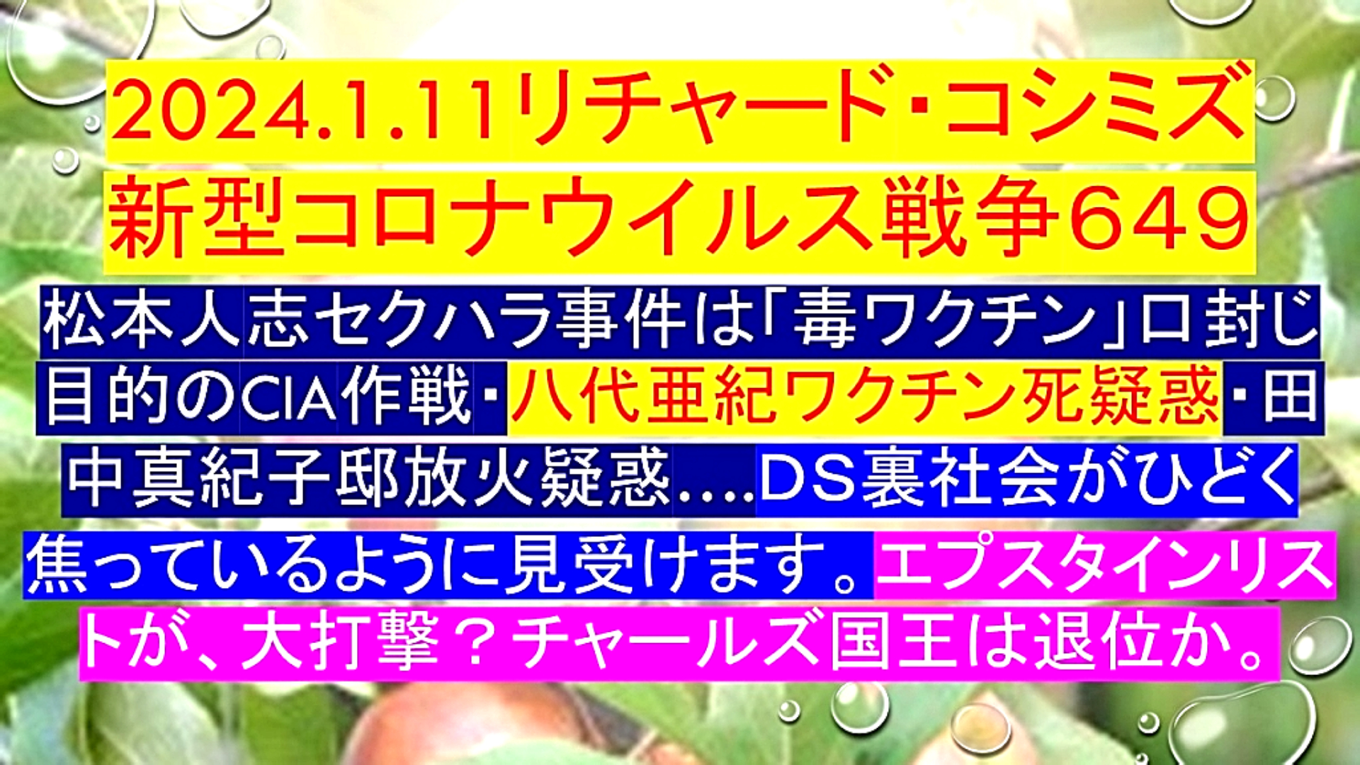 「『松本人志セクハラ事件』は、『毒ワクチン』口封じ目的の『CIA作戦』・『八代亜紀ワクチン死疑惑』・『田中真紀子邸 放火疑惑』....『DEEP STATE裏社会』がひどく焦っているように見受けます。『エプスタインリスト』が、大打撃?『チャールズ国王』は退位か」 |