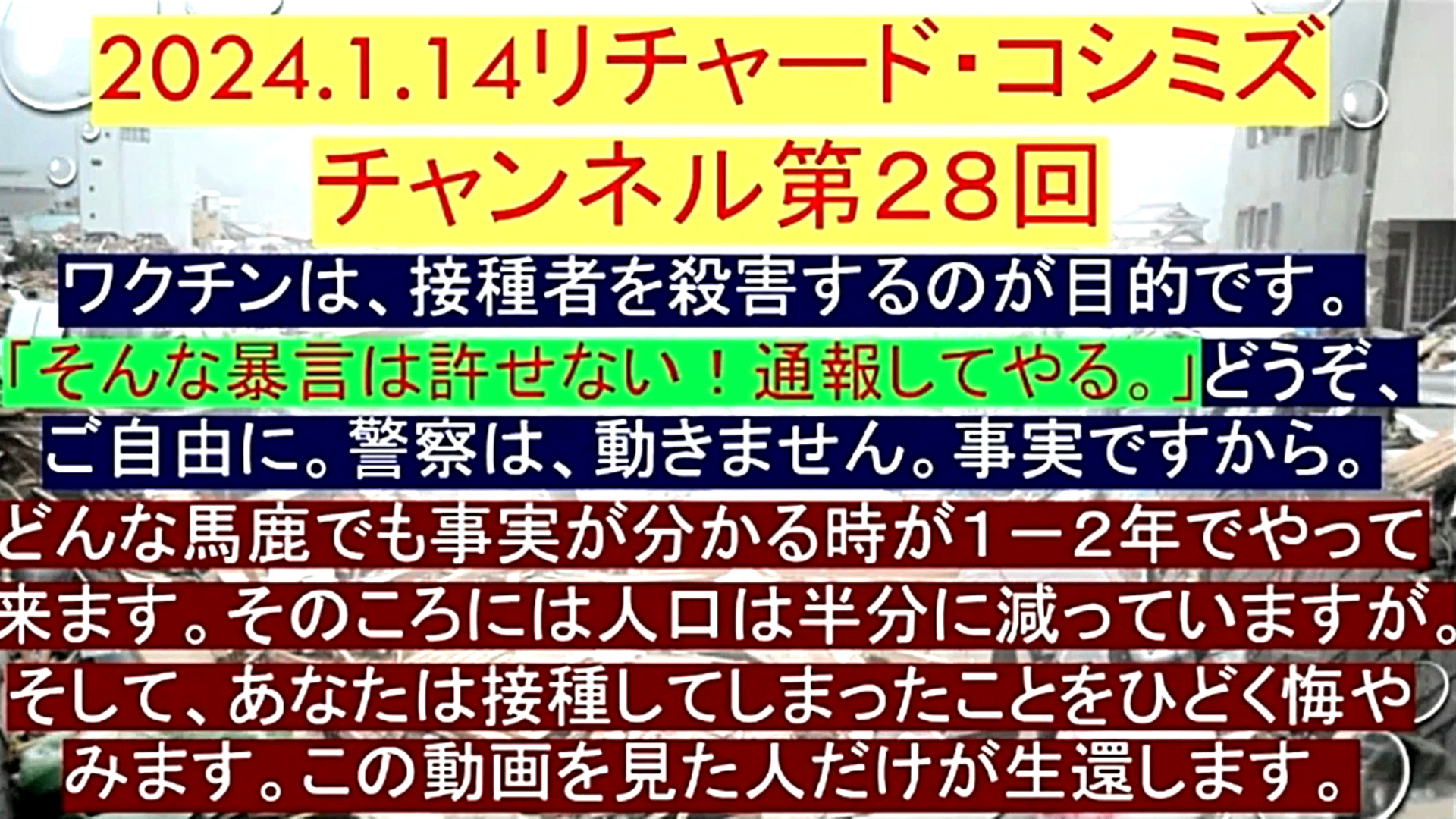 「『ワクチン』は、『接種者を殺害する』のが『目的』です。『そんな暴言は許せない!通報してやる』、どうぞ、ご自由に。『警察』は、動きません。事実ですから。どんな『馬鹿』でも事実が分かる時が『1~2年』でやって来ます。そのころには、『人口は半分』に減っていますが。そして、あなたは、『接種』してしまったことをひどく『悔やみます』。『この動画』を見た人だけが『生還』します」 |