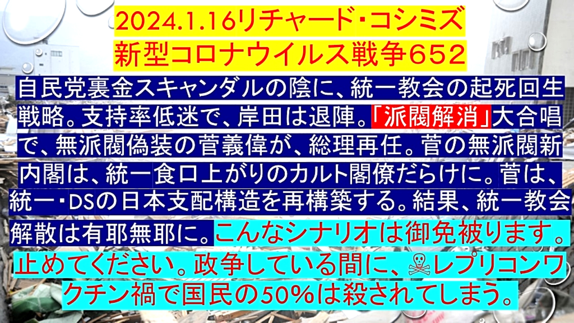 「『自民党裏金スキャンダル』の陰に、『統一教会の起死回生戦略』。『支持率低迷』で、『岸田文雄』は退陣。『派閥解消』大合唱で、『無派閥偽装の菅義偉』が、『総理再任』。『菅の無派閥新内閣』は、『統一食口』上がりの『カルト閣僚』だらけに。菅は、『統一教会・DEEP STATE』の『日本支配構造を再構築』する。結果、『統一教会解散は有耶無耶に』。こんな『シナリオ』は御免被ります。止めてください。政争している間に、『☠レプリコンワクチン禍』で『国民の50%』は殺されてしまう」 |