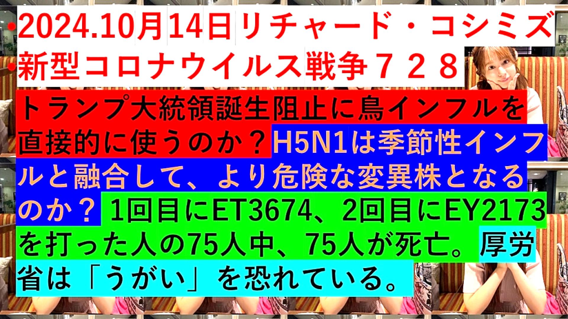 「『ドナルド・トランプ大統領誕生阻止』に、『鳥インフルエンザ』を『直接的』に『使う』のか?『H5N1』は、『季節性インフルエンザ』と『融合』して、より『危険』な『変異株』となるのか?『1回目』に『ET3674』、『2回目』に『EY2173』を『打った人』の『75人中』、『75人』が『死亡』。『厚生労働省』は、『うがい』を恐れている」 |