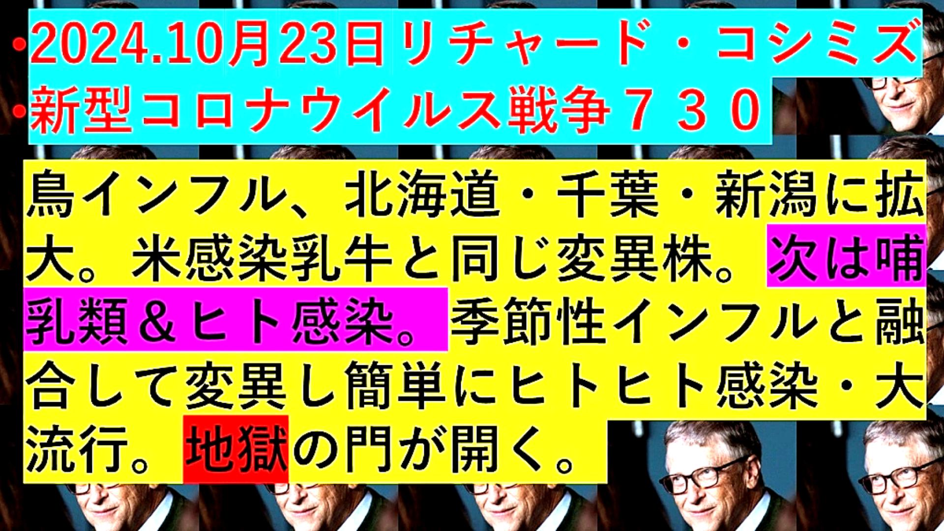 「『鳥インフルエンザ』、『北海道』・『千葉』・『新潟』に『拡大』。『米感染乳牛』と同じ『変異株』。次は、『哺乳類』&『ヒト感染』。『季節性インフルエンザ』と『融合』して『変異』し、『簡単』に『ヒトヒト感染』・『大流行』。『地獄の門』が『開く』」 |