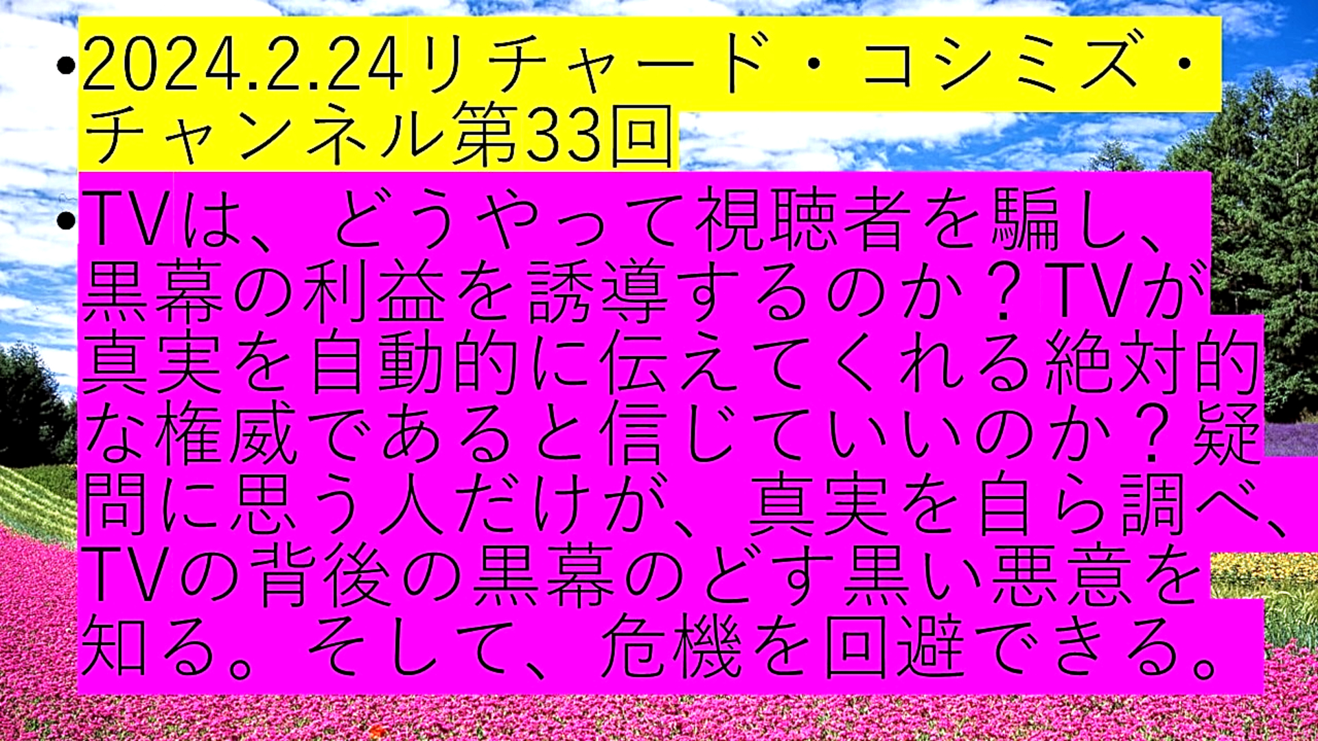 「『TV』は、どうやって『視聴者を騙し』、『黒幕の利益』を『誘導』するのか?『TV』が『真実』を自動的に伝えてくれる『絶対的な権威である』と信じていいのか?『疑問に思う人』だけが、『真実』を自ら調べ、『TVの背後の黒幕』の『どす黒い悪意』を知る。そして、『危機を回避』できる」 |